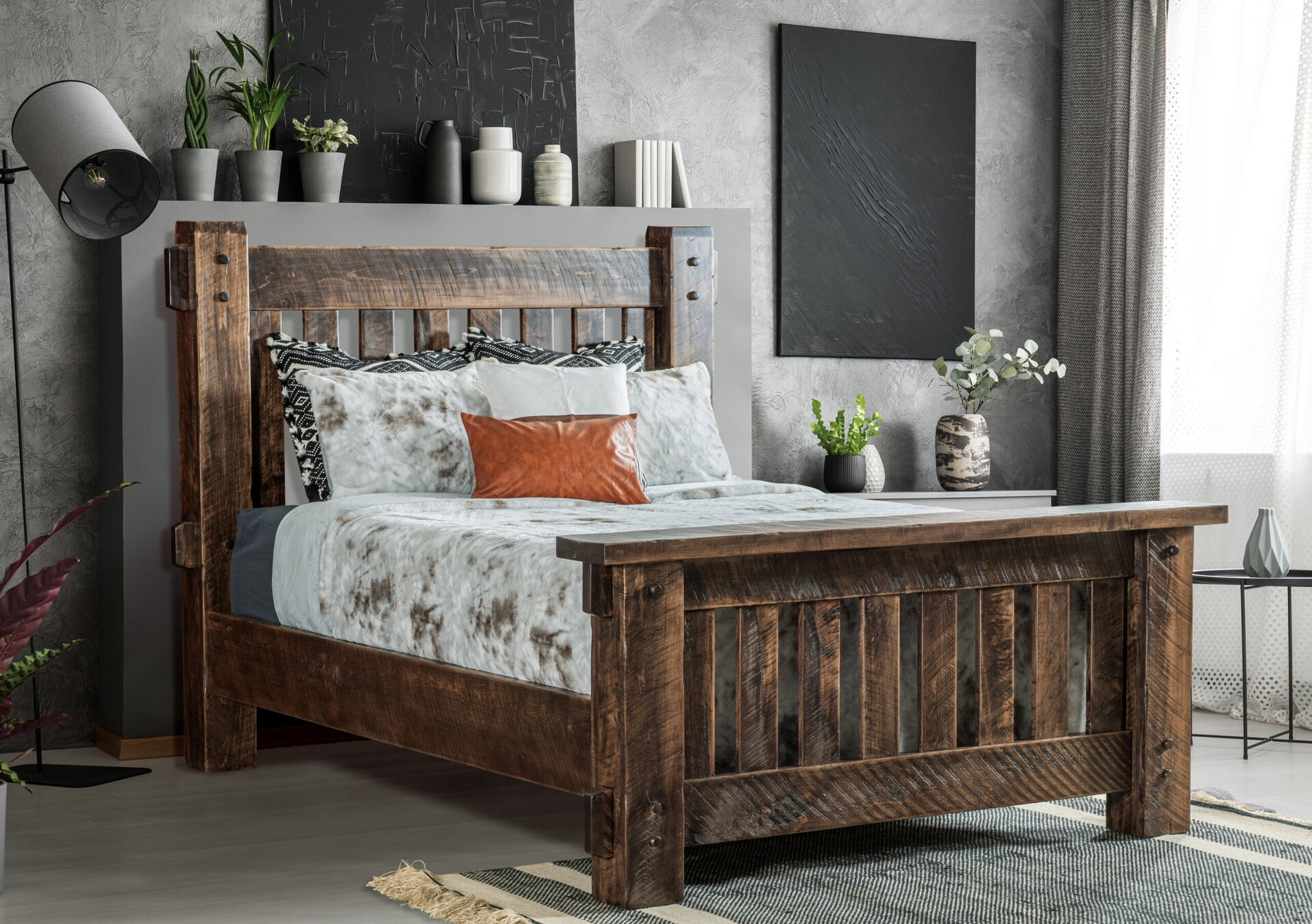 The very essence of ‘rustic.’ Welcome to the Houston Low Bed. Our Amish cabinetmakers build the bed from rough-sawn brown maple. (It’s finished with Almond stain #10 sheen.) Even the saw marks are visible! Also, we use true mortise and tenon joints and wood pins. We offer the bed in your choice of king, California king, queen (shown) or full size. So, you can choose the size that’s right for you. Now, make it yours. Simply complete the customizing fields below. Also, make sure you include your choices for wood species, finish and more. Or call 855-768-3270.