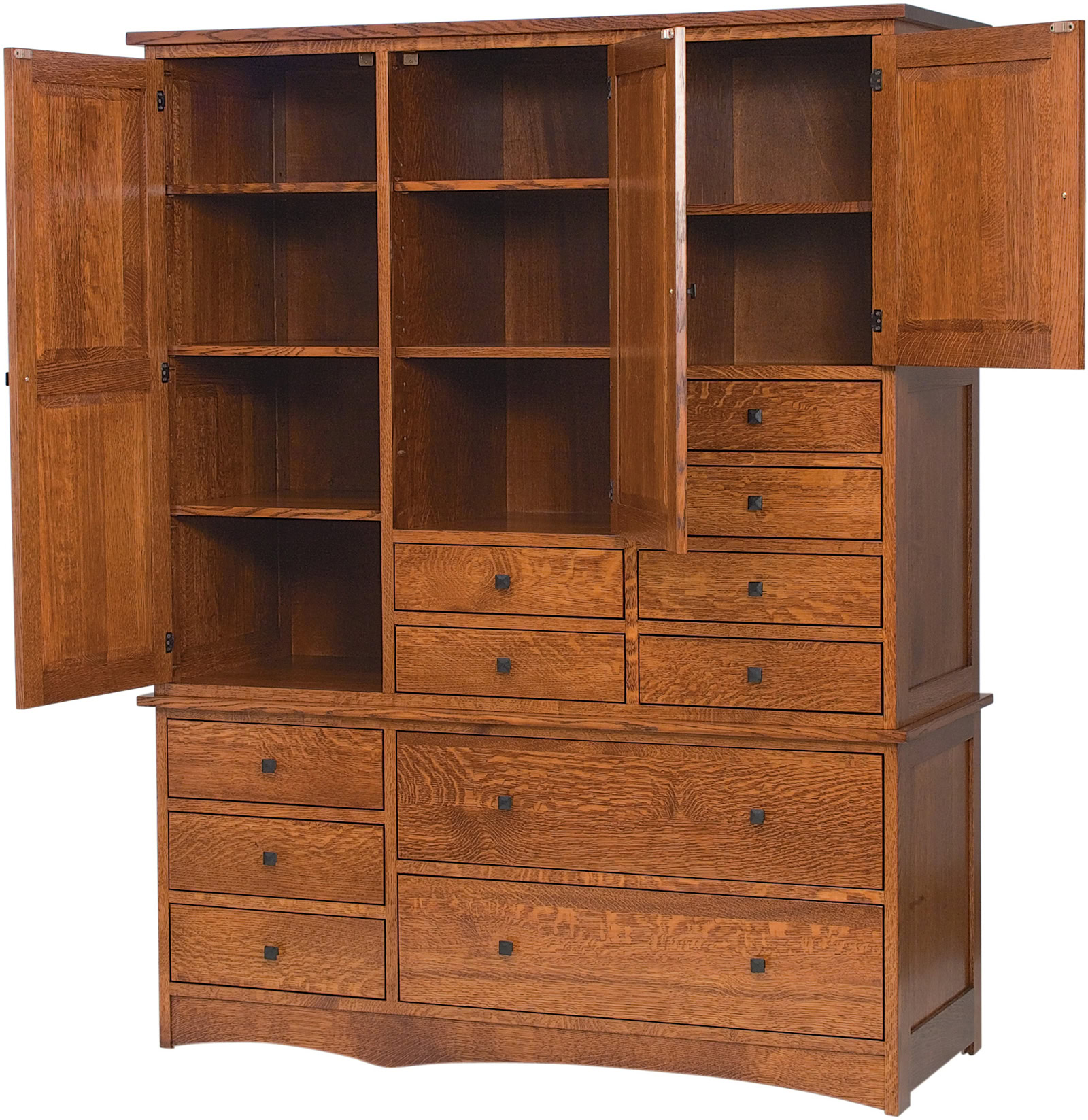 Incredible craftsmanship and dynamic space meet in the Jacobson Storage Unit. With its beautiful reverse panel sides and flush paneled doors, the classic Shaker style of the Jacobson Storage Unit would look great in many rooms. The Jacobson Storage Unit could be utilized for a home office space in an area cramped for space. It features eleven full extension drawers with soft-close options and three-paneled doors covering open storage shelves answering every storage need.