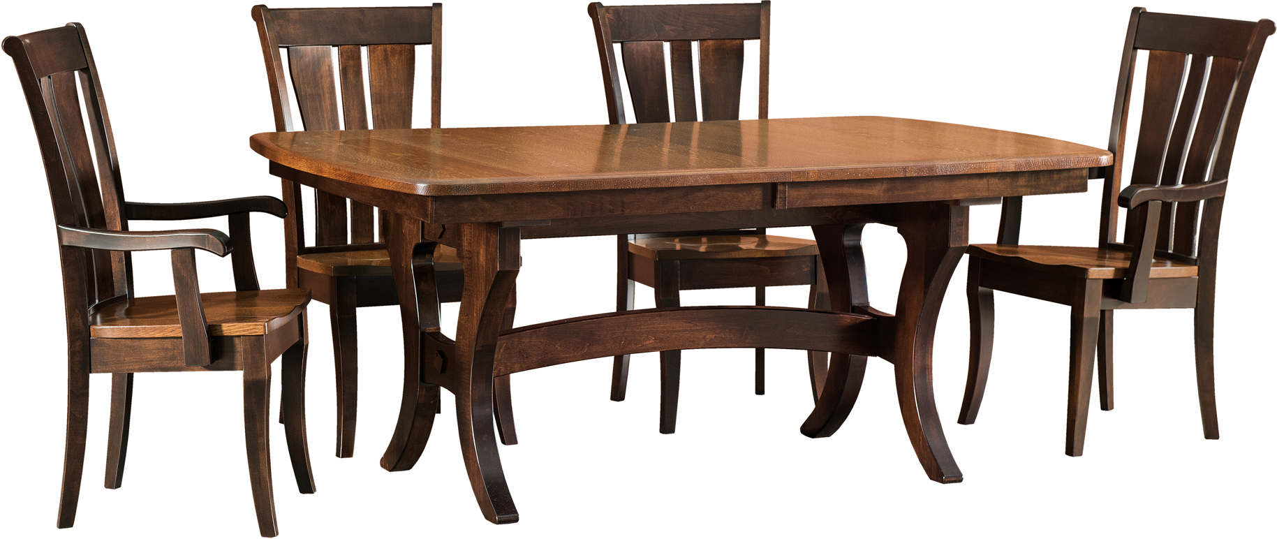 The curved theme of the trestles in the table resonates with the curved features in the chairs of the Jessica Dining Collection. What a spectacular set for your upscale dining room! You can’t miss the hefty 1 ¼-inch-thick solid hardwood top. Also, we offer the table in two widths and three lengths. Plus, you can add up to four leaves. (They conveniently store below the tabletop.) So you can choose the size that best meets your needs and desires. Then, we complement the table with Fenmore side and armchairs. You can order chairs with wood, leather, or fabric seats. Our Amish cabinetmakers use top regional hardwoods. Such as cherry and oak. No wonder the Jessica Dining Collection is so sturdy. Also heirloom-quality! Now, make it yours. Simply complete the customizing fields below. Also, make sure you include your choices for wood species, finish, and more. Or call 855-768-3270.