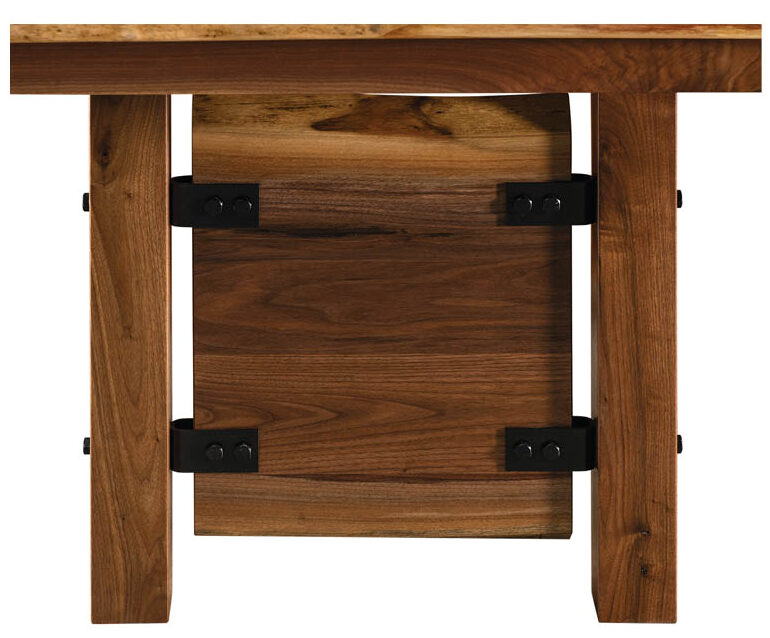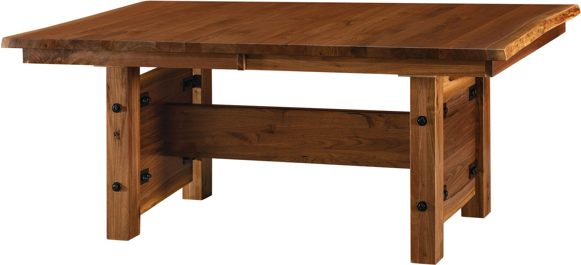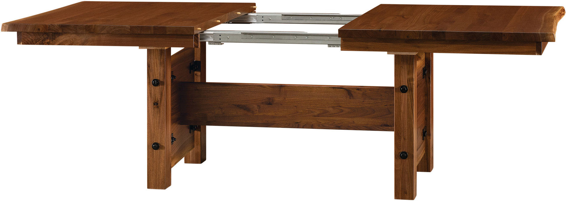 An Amish-built, solid hardwood dining table with a sense of command! Welcome to the Lamesa Trestle Table. The hefty solid wood posts feature wood panels in between – connected by oversized black hardware. The top is made from 1 ½-inch solid hardwood with a live edge on each end. Our Amish cabinetmakers build the table 42 or 48 inches wide and 72 inches long. Want even more room for entertaining friends and family? Simply pull on one end of the table, and the ball bearing slides open up to receive up to four 12-inch leaves. We build the table from tough hardwoods like oak, maple and rustic walnut (shown with a natural finish). No wonder the table is so great-looking, sturdy and heirloom-quality! Now, make it yours. Simply complete the customizing fields below. Also, make sure you include your choices for wood specie, finish and more. Or call 855-768-3270.
