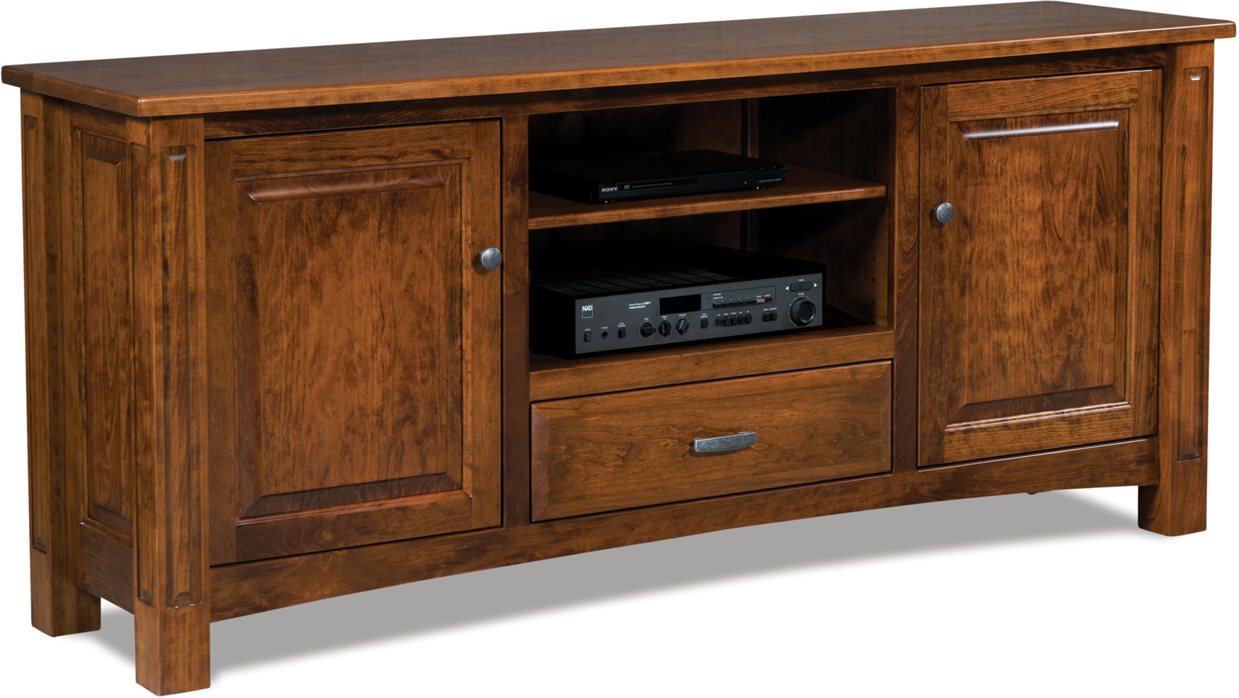 This media stand offers plenty of storage. Two soft-close doors each open to reveal an adjustable shelf. Plus, a full-extension drawer provides a perfect spot for your DVD collection. You have the option of including a wood drawer organizer to keep your collection in order. The open shelving is perfect for your components, which require a line of sight for the remote controls to function properly. Of course, you also have the option to add a door over the center opening, should you choose.
