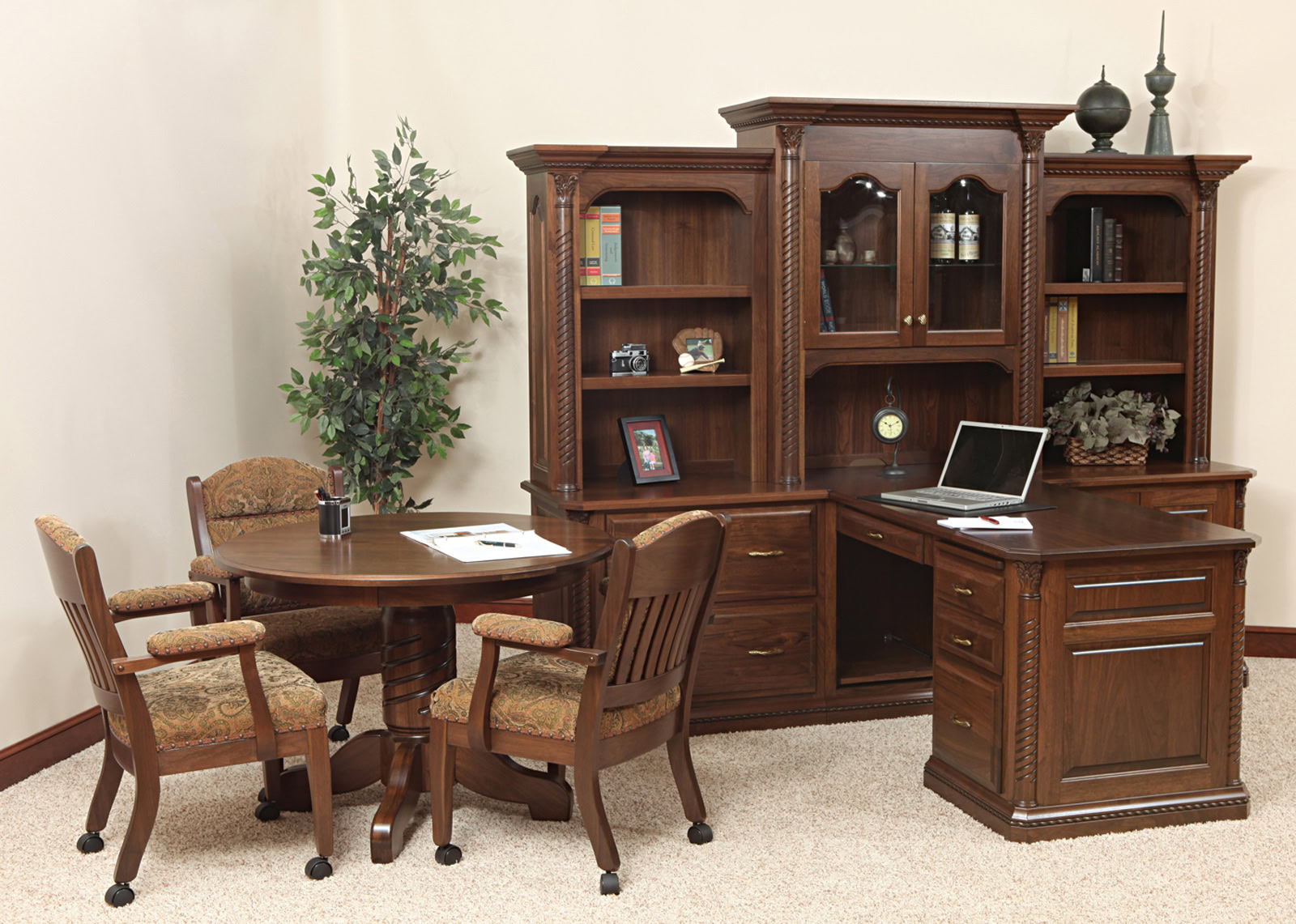 Skilled Amish artisans designed the Lexington Wood Office Set with rope base and crown molding. As well as carved columns. Therefore, create a unique yet elegant wood office set for your workspace. Constructed from solid hardwood, you can rest knowing this office set will last for years to come. Furthermore, this office set is built with several drawers and shelves, this set will provide ample space for all your workday needs. If the elegance of this office set catches your eye, take a look at our other Lexington products.