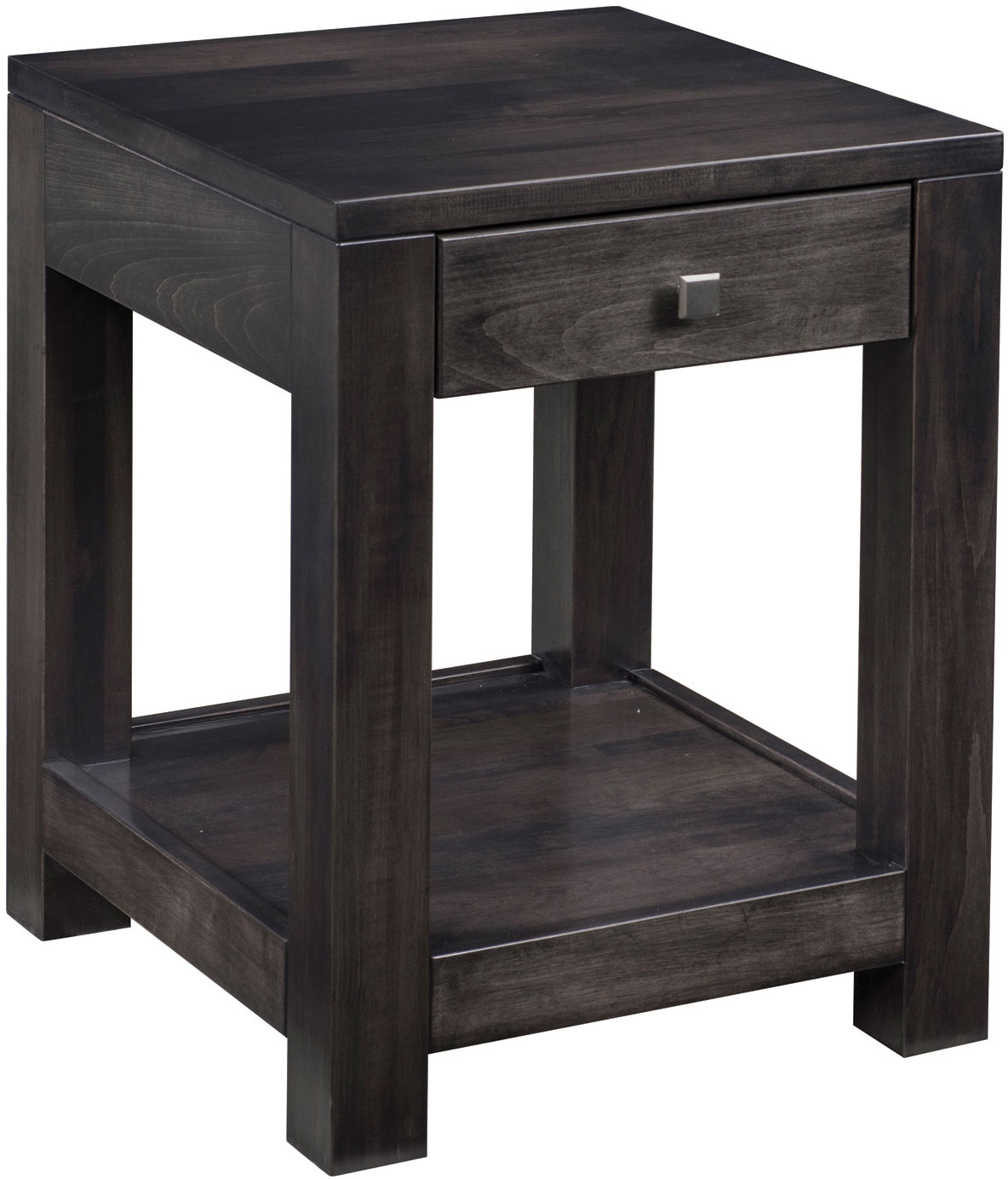 Presenting a modern end table to complement your trendy living room furniture. Welcome to the London End Table. The clean lines, flush drawer, open design and square knob hardware give off a chic vibe. Our Amish cabinetmakers build the table from top hardwoods like oak, cherry and brown maple (shown with FC-19093 Dark Knight stain). No wonder this piece is heirloom-quality! Plus, you can pair the table with the coffee table, sofa table plus other pieces with the same design. Now, make this end table yours. Simply fill out the customization fields below. Also, make sure you tell us your choices for wood species, finish and more. Or call 855-768-3270.