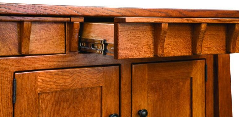 The designers of the Manitoba Sideboard artfully concealed the two drawers among the corbels. Cool, huh? And both drawers open full extension. So you can enjoy easy access to everything in the drawer. Even items stored at the very back. Try getting your treasures into and out of the back of a loaded drawer that only opens partway! Also, under-mount drawer slides make closing the drawers easy. Gently push an open drawer. And the drawer closes completely. In addition, dovetail drawer joints enhance their strength and durability.