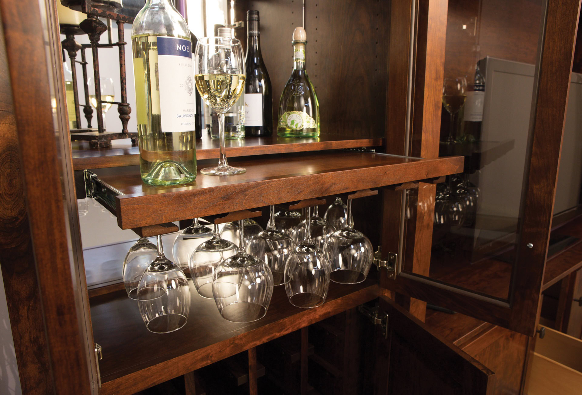 This TV wall unit offers a tremendous amount of flexible storage, so you will be able to easily store all of your media accessories in one place. Each pier (side unit) has adjustable wood shelving with glass inserts behind the glass doors. The bottom doors on the left pier reveal a wine storage rack. A pull-out stemware tray sits behind the glass doors just above, so it is a nice spot to congregate with guests. The bottom doors on the right pier reveal an additional shelf and storage space. The base console offers more adjustable shelving as well as a drawer behind each of the center doors.