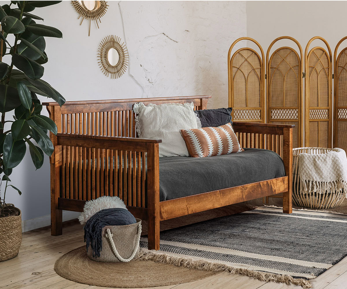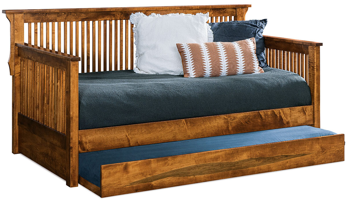 Clean lines, slats and decorative corbels put the ‘Mission’ into the Mission Day Bed. What a stately and elegant piece for your second bedroom or spare room! Also, this piece will complement your existing items of furniture. Our Amish cabinetmakers handcraft this piece from top hardwoods like maple, cherry and oak (shown with Vintage American stain). No wonder the day bed is so sturdy and heirloom-quality! Now, make it yours. Simply complete the customizing fields below. Also, make sure you include your choices for wood species, finish and more. Or call 855-768-3270.