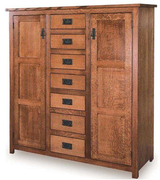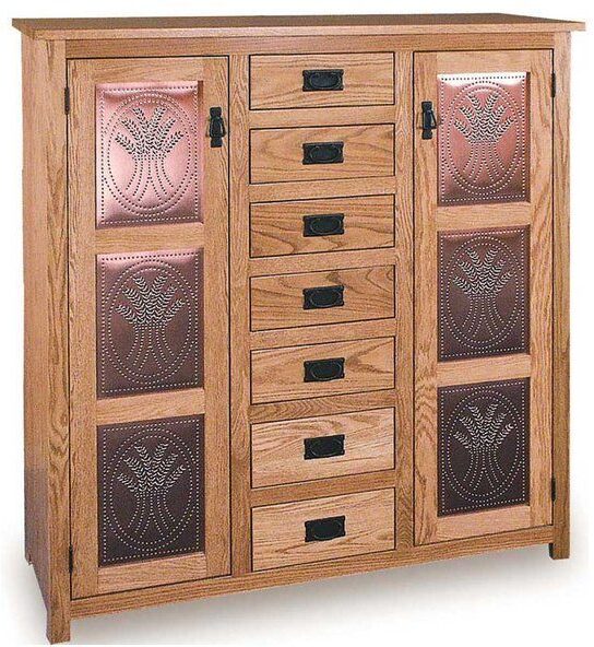 A pantry cabinet that recaptures the vibe of an old-fashioned pie safe, the stately look of the Mission style and the benefits of Amish cabinetmaking. Welcome to the Mission Large Pie Safe. The flush drawers and doors and the black Mission hardware grab your attention. The seven drawers open full-extension. This means easy access to everything inside. Even items at the back. Also, we place adjustable shelves behind the doors to maximize the storage space. What’s more, the doors are available with your choice of reverse raised wood panels, leaded glass or a pie safe tin design (shown). Our Amish cabinetmakers build the cabinet from solid hardwood. So, it’s sturdy and heirloom-quality. Now, make the unit uniquely yours. Simply complete the customizing fields below. Also, make sure you include your choices for wood species, finish and more. Or call 855-768-3270.
