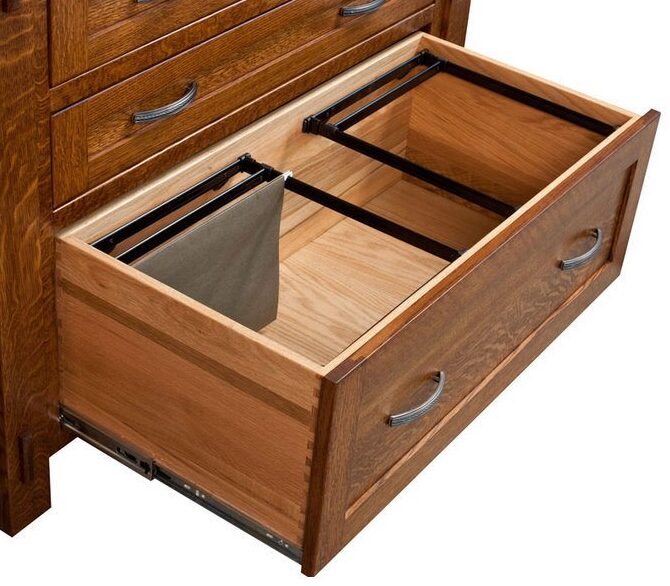 Imagine sitting behind this custom-built, solid hardwood desk. We built it with a cord access hole and 4-outlet power strip. So you you can plug in your laptop, accent light or other devices. Also, the handy drop-down lid provides a great work space. And the cubicles and drawers give you room to stash your office stuff. Like mail, stamps and papers. What’s more, the large bottom drawer comes equipped to store your hanging files. While the two center drawers are ideal for your additional office supplies. What’s more, the drawer are built with dovetail joints for strength and durability.