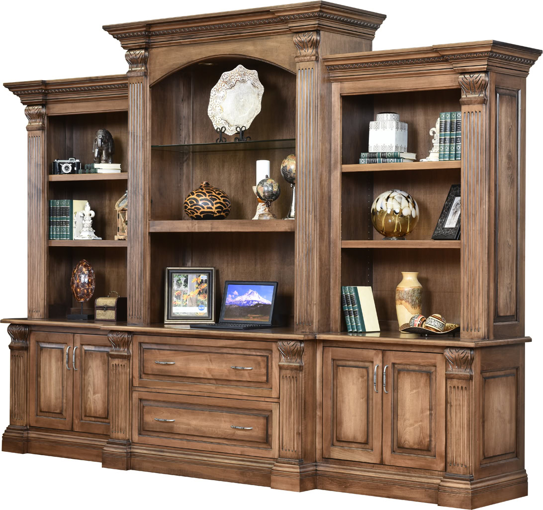 Skilled Amish artisans designed the Montereau Office Set with ornate carvings and crown molding. Therefore creating an elegant office set for your home office. This set includes the Montereau Executive Desk and the Montereau Base and Three Piece Hutch. You will enjoy having this office set in your home or workspace. Furthermore, this office set offers custom options, such as a Corian inlay desktop. If the elegance of this office set catches your eye take a look at our other Montereau products.