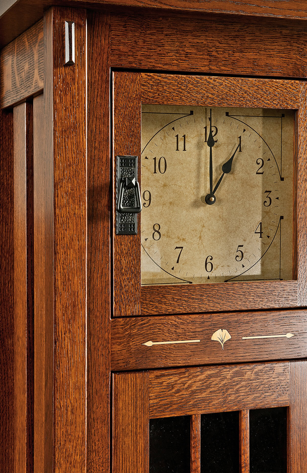 The Morgan Clock brings Old World elegance and beauty into your 21st century home. So notice the tenon accents. Plus the vintage hardware. Also the tapered profile and yellowheart ginkgo leaf and arrow inlays. Check out the mullion glass door. Behind it are two adjustable glass shelves and a curio light. So you can show off your favorite figurines. Even in a darkened room! The deep drawer comes with dovetail joints. And they’re renown for strength. Also, the ball-bearing slides ensure smooth, easy operation. Skilled Amish cabinetmakers handcraft each Morgan Clock. They even finish the back. And include a battery-operated dual chiming movement. Ready to order? click the “Customize this product” button below. Then, complete the “Customize Product” fields. Also click the “Get your customized quote” button.