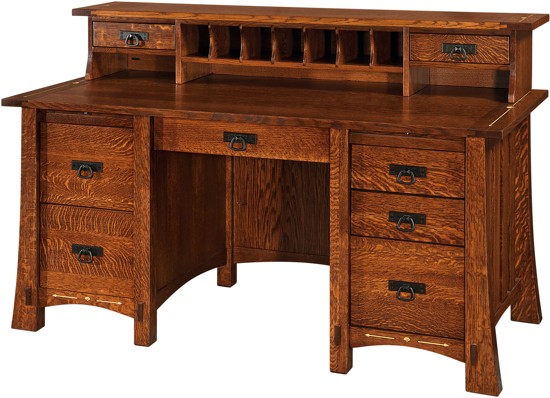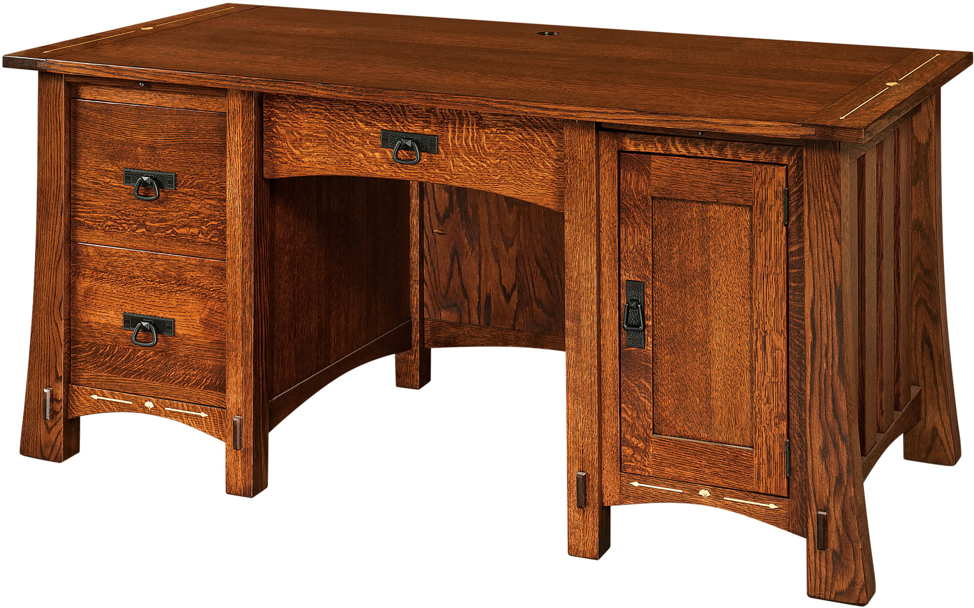 When it comes to desks with retro features and solid hardwood construction, the Morgan Desk Collection rises to the top of the pack. And what a showpiece of cabinetmaking excellence! Notice the yellowheart ginkgo leaf and arrow inlays on the desktop and pedestals. Also, we integrate breadboard ends into the 1-inch-thick desktop and desk topper.