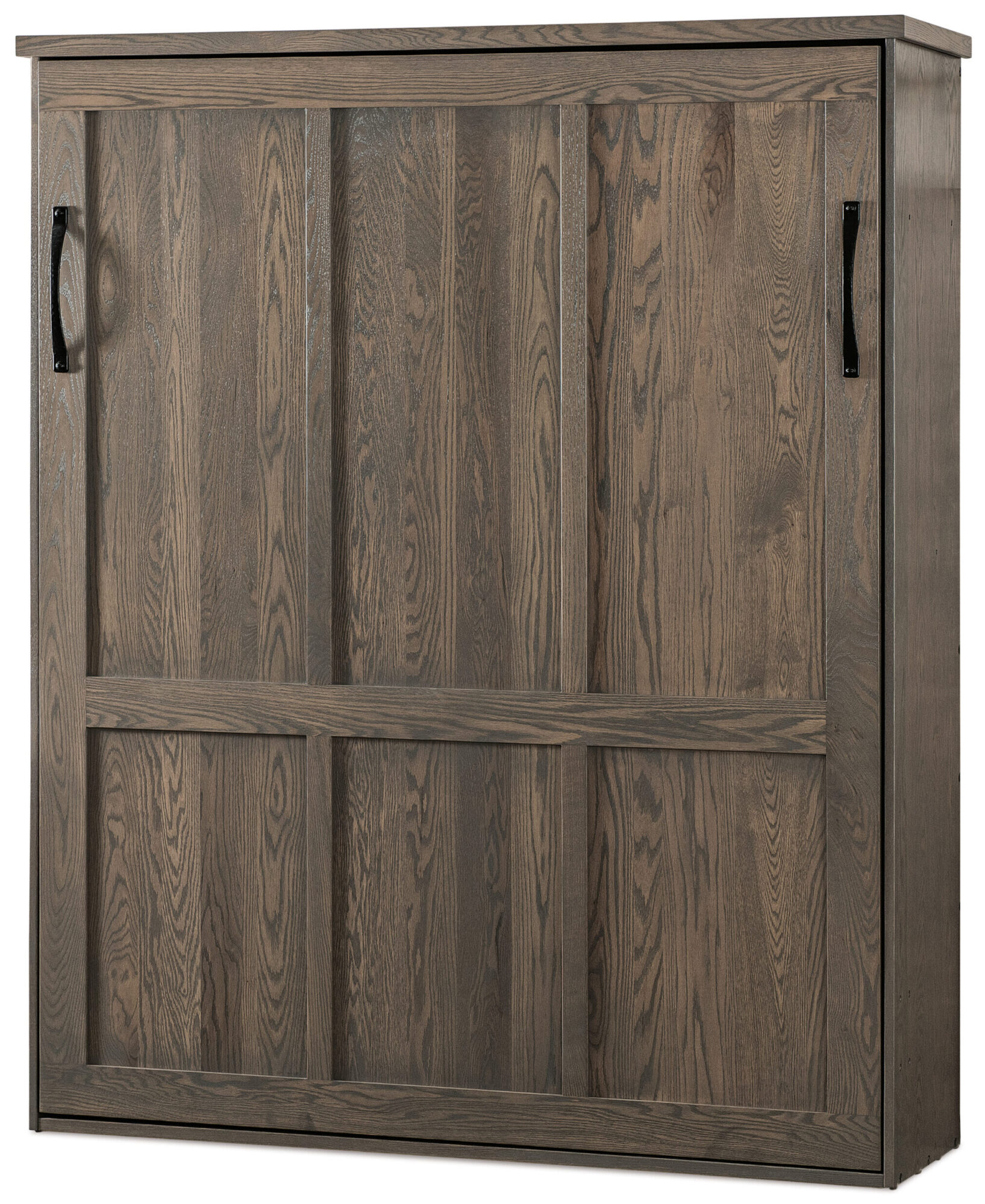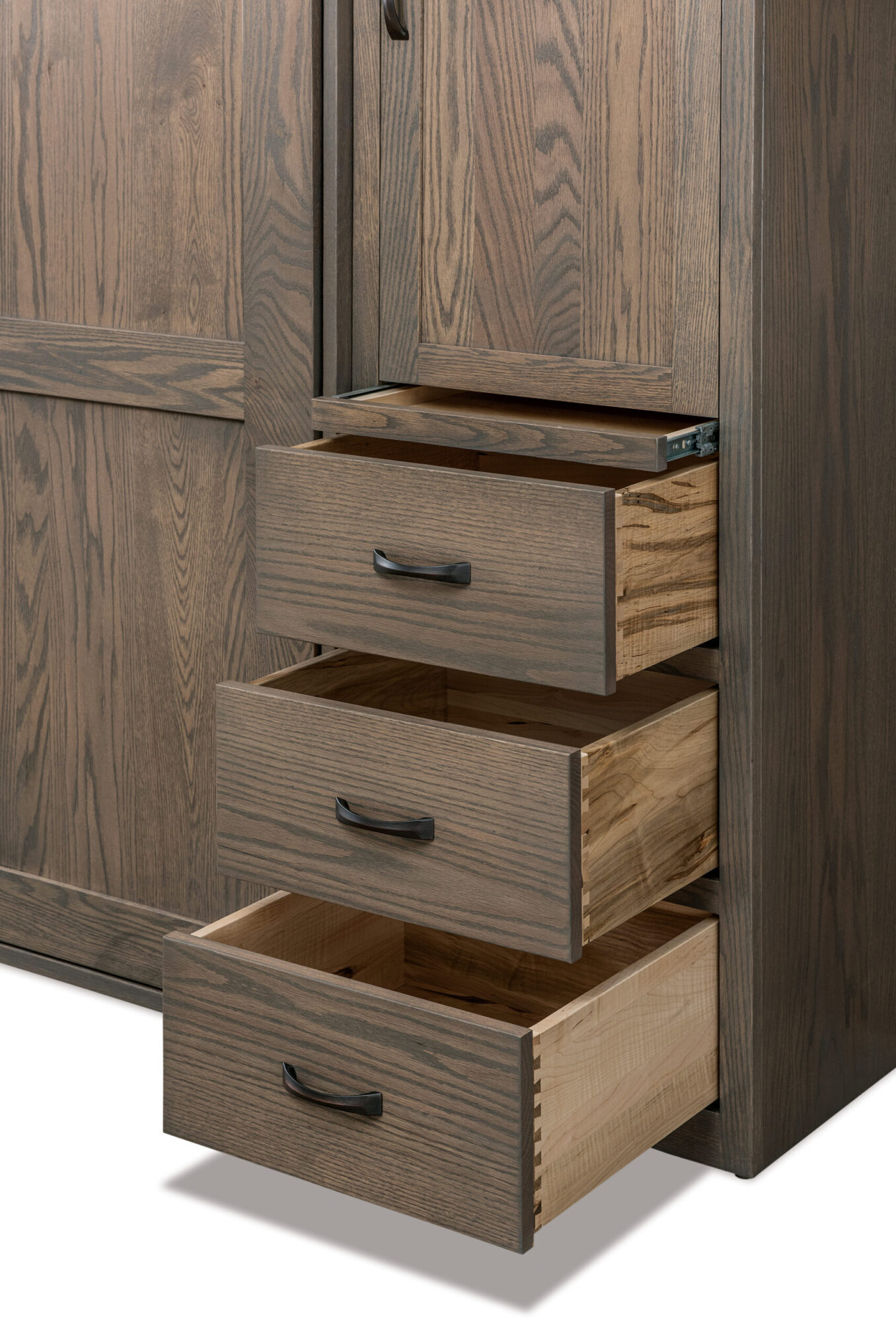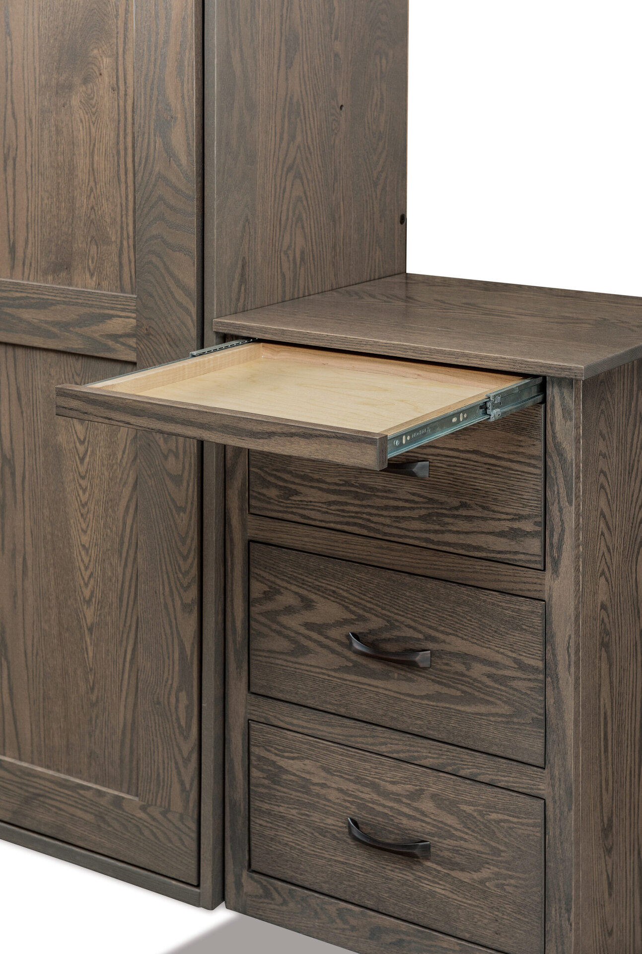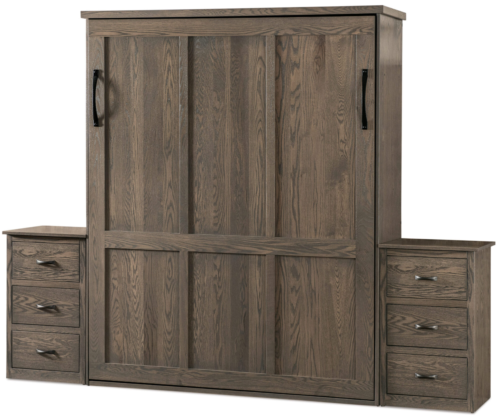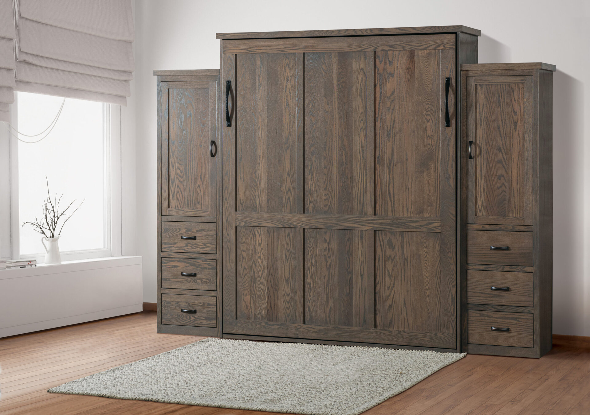 A retractable bed flanked by nightstands and a small desk. That’s the Murphy Bed. It’s the ideal choice for any upscale living area with limited floorspace. The bed looks like a handsome wardrobe when it’s flipped up. Pull on the handles, and the bed flips down. You can order the bed in queen, full or twin sizes. Your choice! Our Amish cabinetmakers build the bed. And they use top hardwoods like oak, cherry and brown maple (shown with Earthtone stain). Our builders also draw upon tried-and-proven shop skills handed down from their ancestors in the old country. No wonder the piece is so sturdy and heirloom-quality! Now, make it yours. Simply complete the customizing fields below. Also, make sure you include your choices for wood species, finish and more. Or call 855-768-3270.