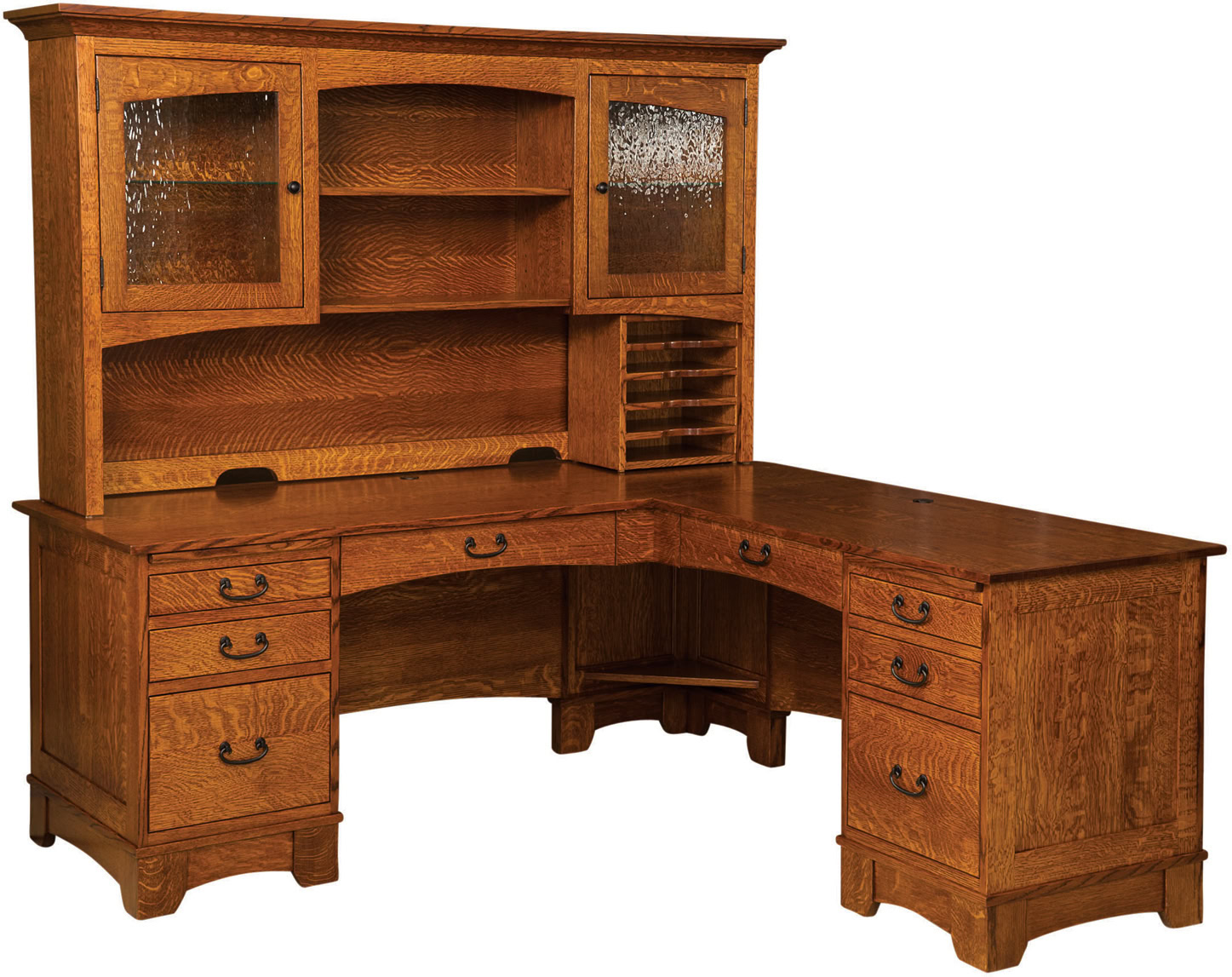 The Noble Mission L-Shaped Desk combined with the hutch is an absolutely beautiful office set. It’s the perfect choice if you’re looking for a workspace with all the frills. Imagine your computer on the desk and your work papers all spread out on the large tabletop space — including the pullout writing board above each pedestal! We equip the optional hutch with open storage plus storage space behind glass doors (Water Glass shown). It’s great for storing books and collectibles! The drawers open full-extension for easy access to all the items inside. Our Amish cabinetmakers build the desk. And they use top hardwoods like quarter-sawn white oak (shown with Michaels Cherry Stain). No wonder the desk is so sturdy and heirloom-quality! Now, make it yours. Simply complete the customizing fields below. Also, make sure you include your choices for wood species, finish and more. Or call 855-768-3270.