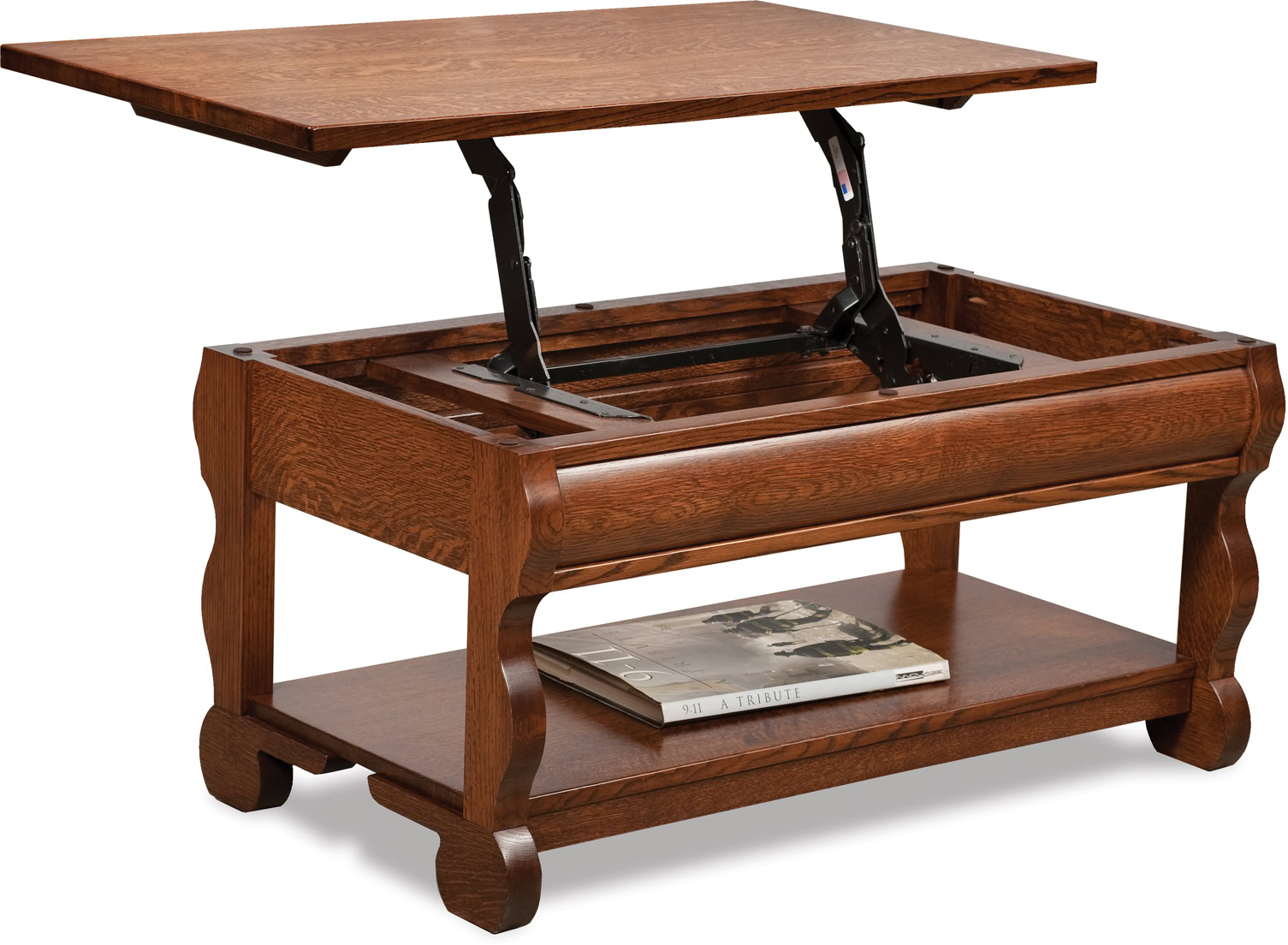Skilled Amish artisans painstakingly handcraft each coffee table. And they use solid hardwoods like maple, oak and hickory. So the Old Classic Sleigh Coffee Table with Lift Top should give your family decades of enjoyment. With a gentle pull, the 1-inch-thick, counter-weighted top rises and smoothly glides toward you. And it converts to a snack counter and work/play area. Also, the table top makes an ideal spot to surf the web or play a game. And to read a book or catch up on paperwork. All from the comfort of your sofa. Plus, the 3 1/4 inch deep recessed storage area under the top, plus the shelf below, provide space for keeping your favorite coffee table items.