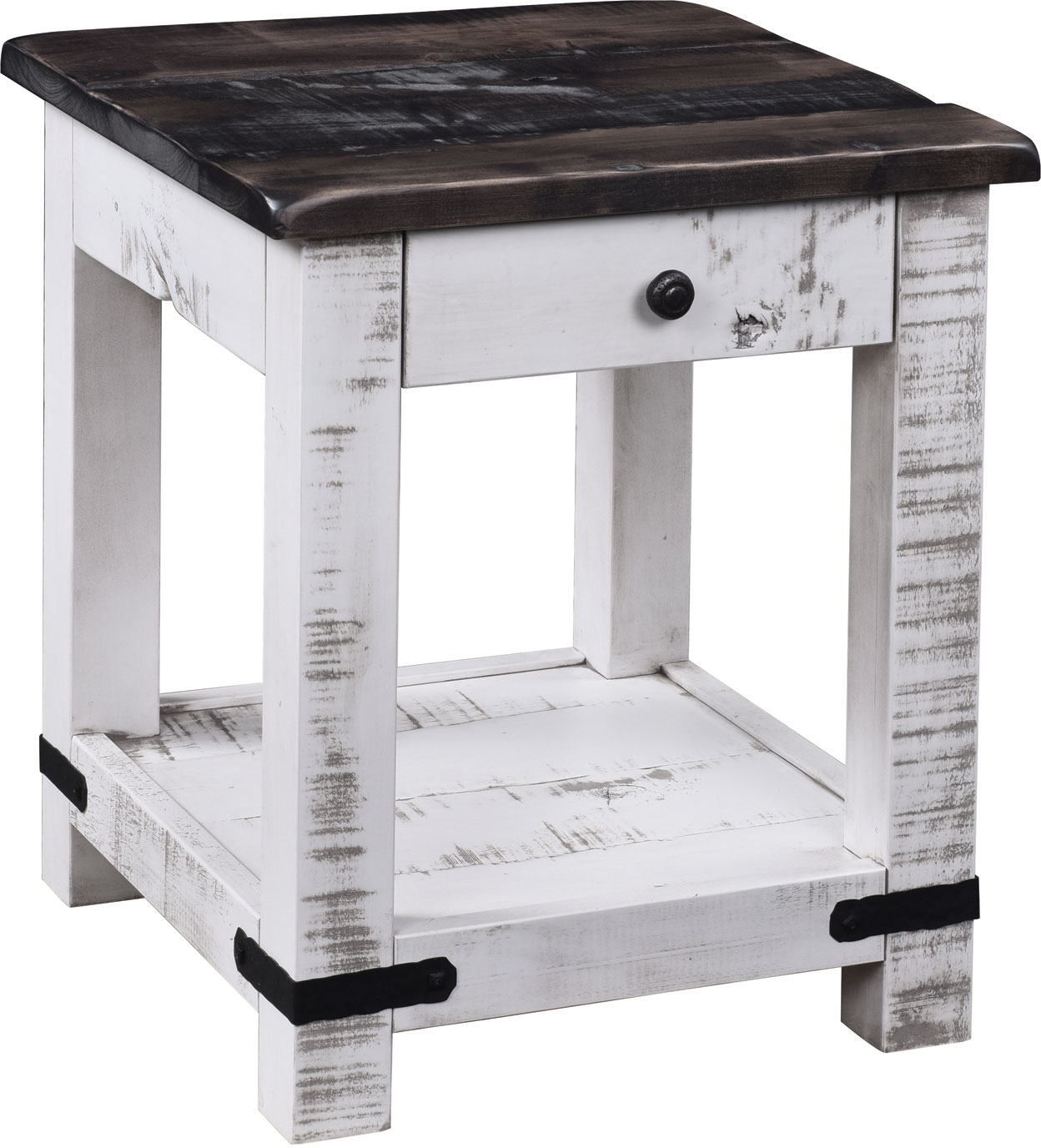 Presenting an end table that defines rustic elegance: the Old Tymes End Table. It is two-toned. Because we paint the base white and add an Antique Gray Glaze. While we give the top an AIM Dark Gray finish. Also, check out the visible saw marks and metal corner accents. Our Amish cabinetmakers build the table from rustic brown maple hardwood. So, the table is heirloom-quality. Imagine how much this piece will enhance the rustic look and feel of your living room! And you can complement it with other Old Tymes pieces. Now, make it yours. Simply fill out the customization fields below. And make sure you tell us your choices for wood species, finish and more. Or call/text 855-768-3270.