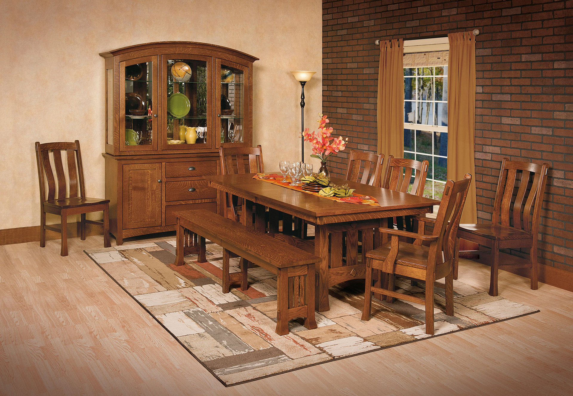 The Olde Century Mission Dining Set offers a classic mission style. Entertaining family and friends is sure to become a favorite past time with this beautiful dining set. It includes the rectangular table, hutch, Olde Century Dining chairs and Olde Century Dining Bench. See the room image for more details. Our Amish artisans handcraft each of these pieces out of solid hardwoods. They ensure it is to your exact specifications, too. So, choose your wood species and finish it to match your current décor. Additionally, you can leave it unfinished for a natural look. Determine the size of your dining space and decide which size table and hutch will best fit your space.