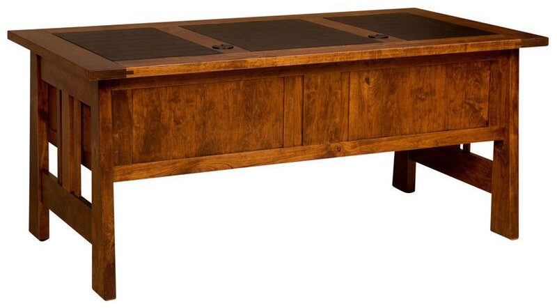 Flush drawer fronts, rustic hardware, slats and a tapered profile set the Open Freemont Mission Pedestal Desk aside as for its user-friendliness and great looks. The back is finished. So, the desk looks great from every angle. Imagine this cabinetmaking masterpiece as the central focus of your home office! The drawers open full-extension. This means easy access to all your files and office supplies. Also, writing pullouts give you extra workspace. Our Amish cabinetmakers build the desk. And they use top hardwoods, like rustic cherry (shown with Michael’s Cherry stain). No wonder the piece is so sturdy and heirloom-quality. Now, make it uniquely yours. Simply complete the customizing fields below. Also, make sure you include your choices for wood species, finish and more. Or call 855-768-3270.