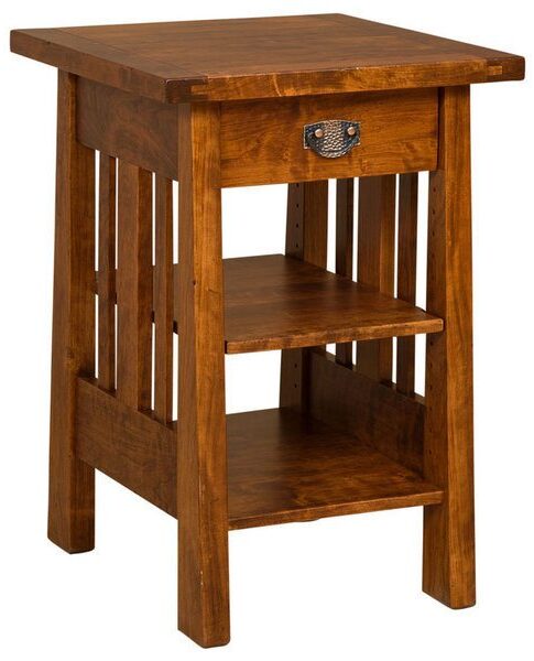 The stately look of the Mission style, the practical features of a printer stand. That’s the Open Freemont Mission Printer Stand. Check out the eye-catching slats and tapered profile. With the hefty, solid hardwood top, adjustable top shelf and bottom shelf, you’ll find lots of room for your printer, paper and printing supplies. Also, you may order the stand with or without a drawer. Our Amish cabinetmakers build the table. And they use top hardwoods, like oak, cherry and maple. No wonder the piece is so sturdy and heirloom-quality. Now, make it uniquely yours. Simply complete the customizing fields below. Also, make sure you include your choices for wood species, finish and more. Or call 855-768-3270.