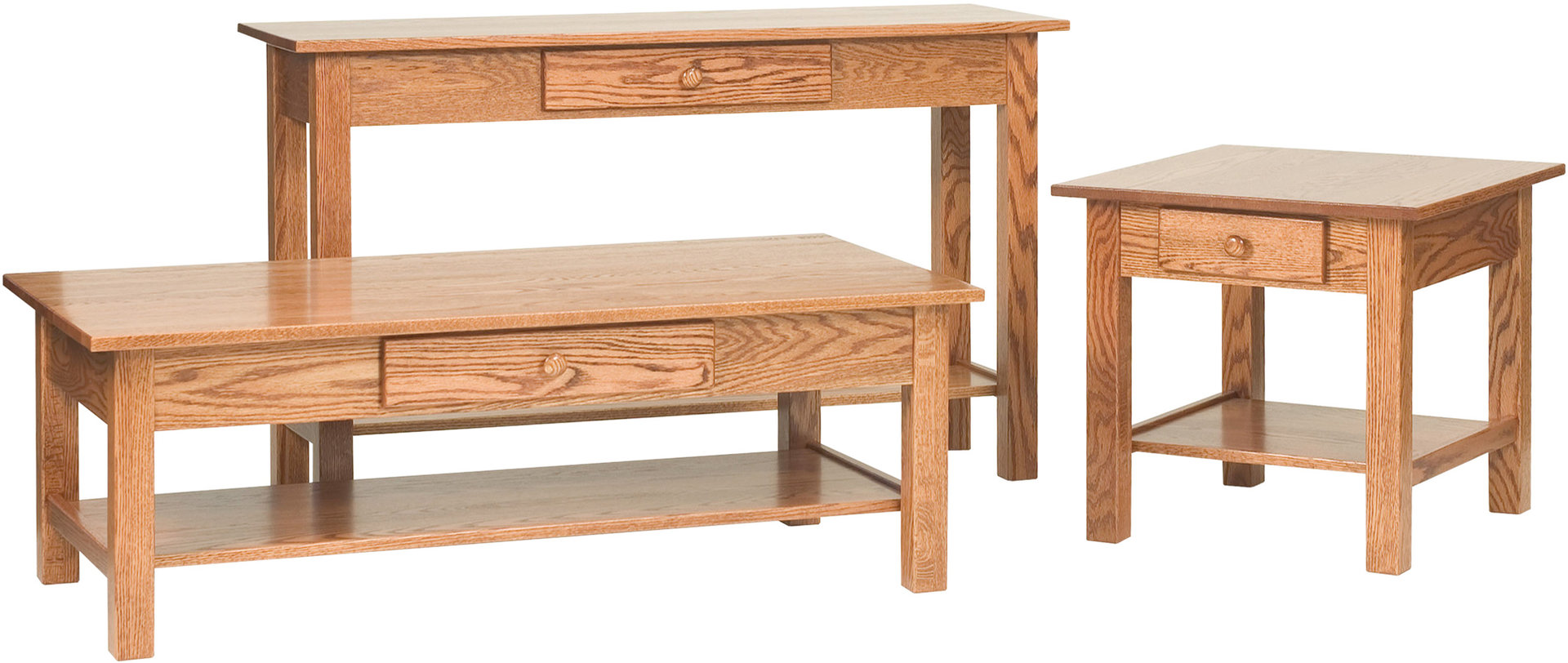 The Mission style in all its simplicity, straight lines, and robust persona. That’s the Open Mission Occasional Table Collection. Indeed, the sofa table, coffee table, and end table will complement your other furniture. While adding distinction and elegance to your living room. The drawers open full extension. So you’ll enjoy easy access to everything. Even items at the back. While dovetail drawer joints excel in strength. Our Amish artisans build the Open Mission Occasional Table Collection. Also, they use top hardwoods. Such as oak (shown with Medium Walnut stain). The tops are ¾-inch solid hardwood. No wonder the set is so sturdy. Durable. And heirloom-quality! Now, make it yours. Simply complete the customizing fields below. Also, make sure you include your choices for wood species, finish, and more. Or call 855-768-3270.