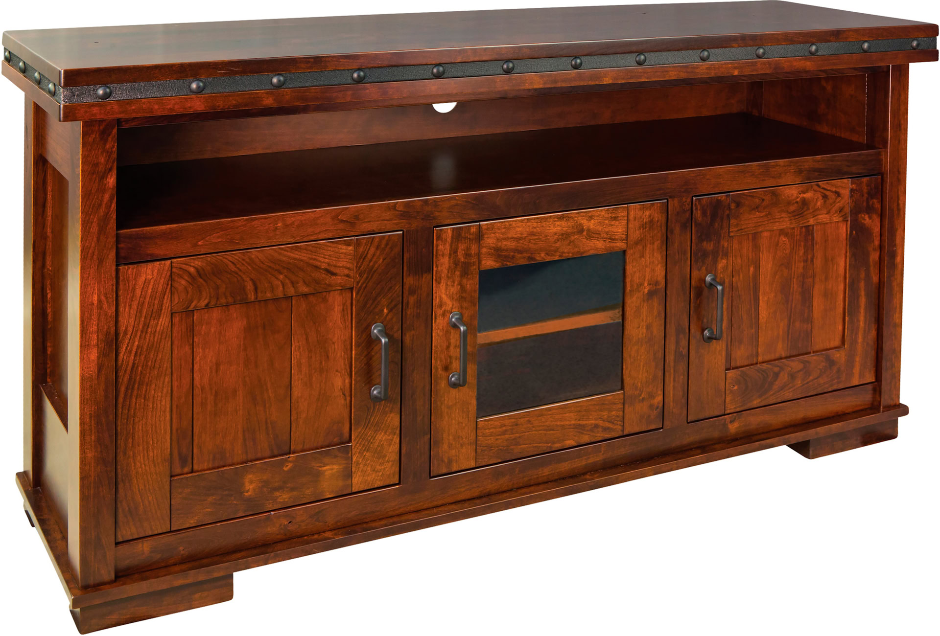 The Pasadena TV Cabinet has the perfect look for a modern, industrial home decor style. It would be perfect for a man cave! It features a 1 inch steel band and buttons, so it has a very unique look. Each of the three soft-close doors has an adjustable shelf behind it. So, this stand offers plenty of flexible storage space.