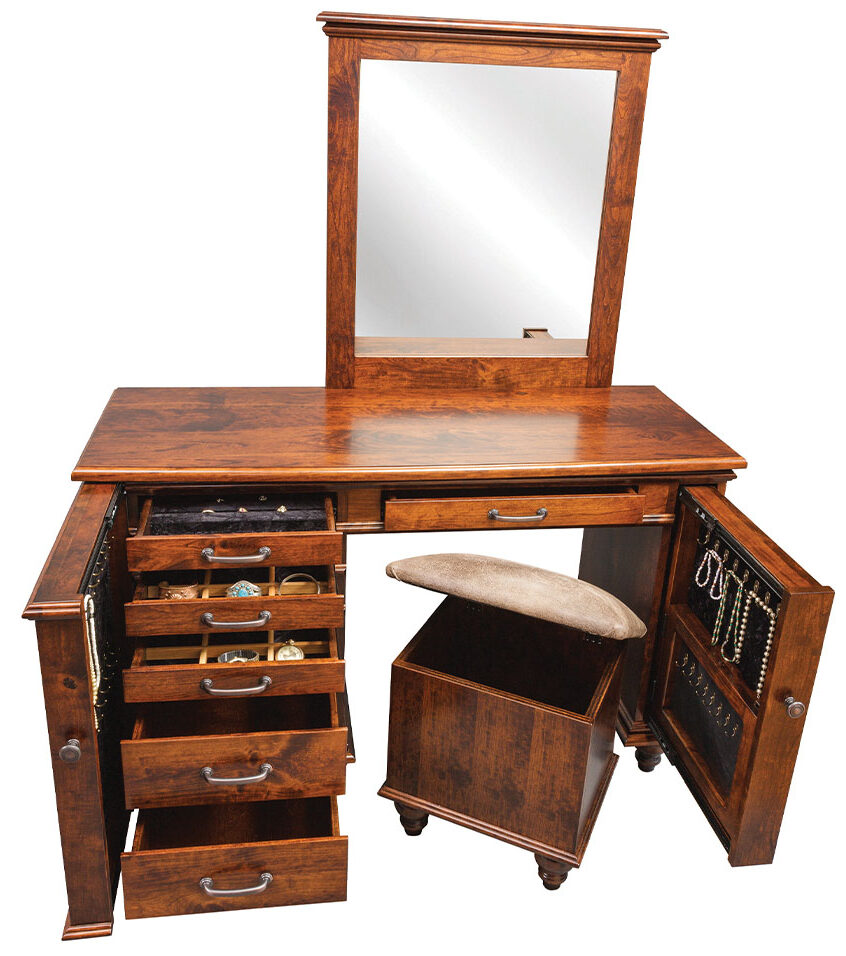 Contact us! Select and customize the Plymouth Jewelry Dressing Table for your jewelry storage and vanity needs. Choose your options and request a quote: email, call, or visit us at our store in Shipshewana. We are happy to help you in any way! Please browse through our jewelry armoires, cabinets, and other related products so you can complete the perfect look in your bedroom.