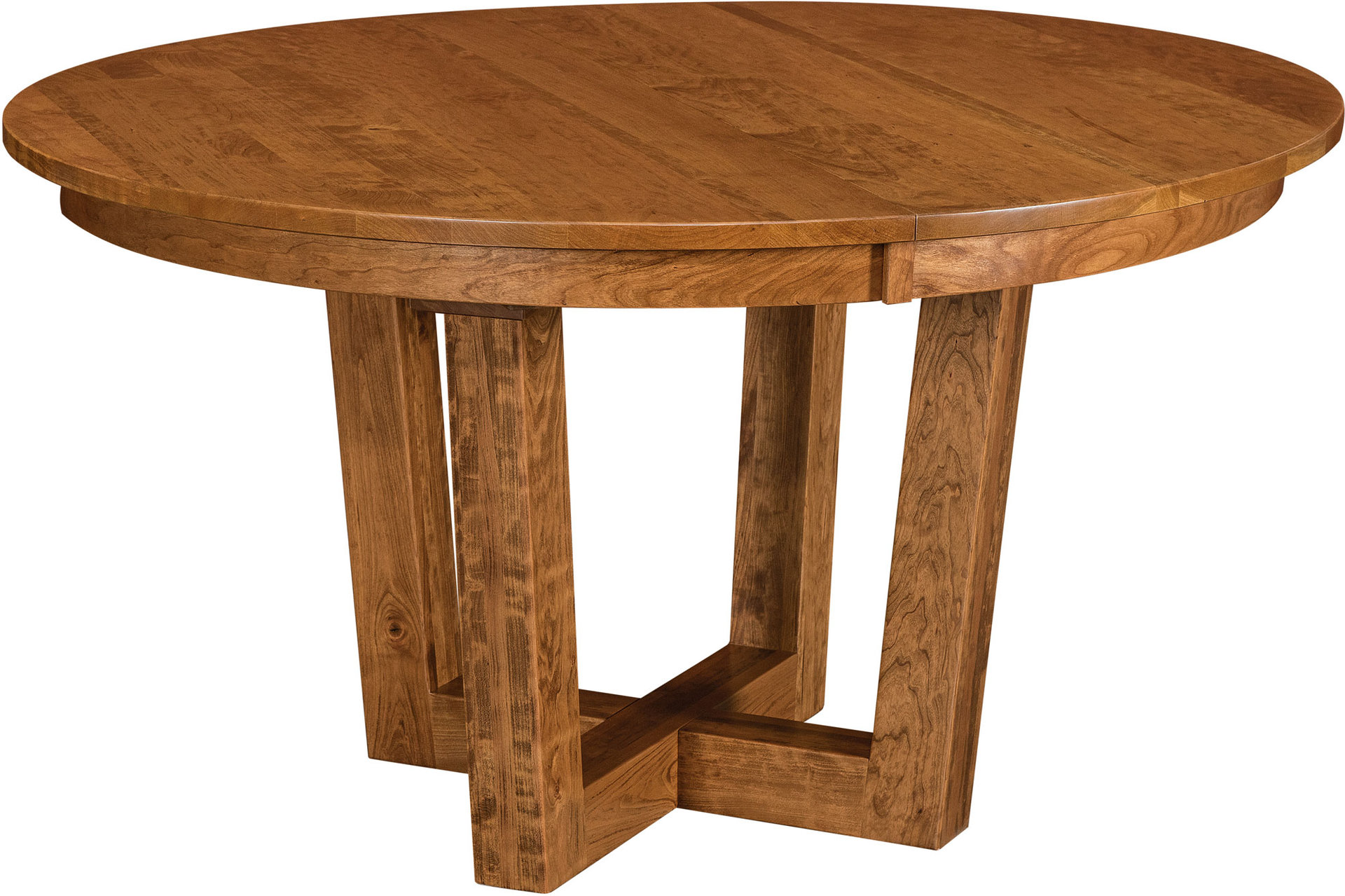 Four hefty, tapered posts crisscrossed at the bottom support the round top of the Portland Single Table. What a visually stunning choice for your upscale dining room! The 1-inch solid hardwood top with the wide skirt symbolizes the strength and quality of the piece. We offer the table in diameters of 48, 54 and 60 inches. Your choice. You can extend the table by adding an 18-inch leaf with the built-in butterfly system or two 12-inch leaves with the alternate gear system. Our Amish cabinetmakers build the table. And they use top hardwoods like oak, maple and rustic cherry (shown with FC-44688 Medium Walnut finish). No wonder the table is so sturdy and heirloom-quality! Now, make it yours. Simply fill out the customizing fields below. Also, make sure you include your choices for wood species, finish and more. Or call 855-768-3270.