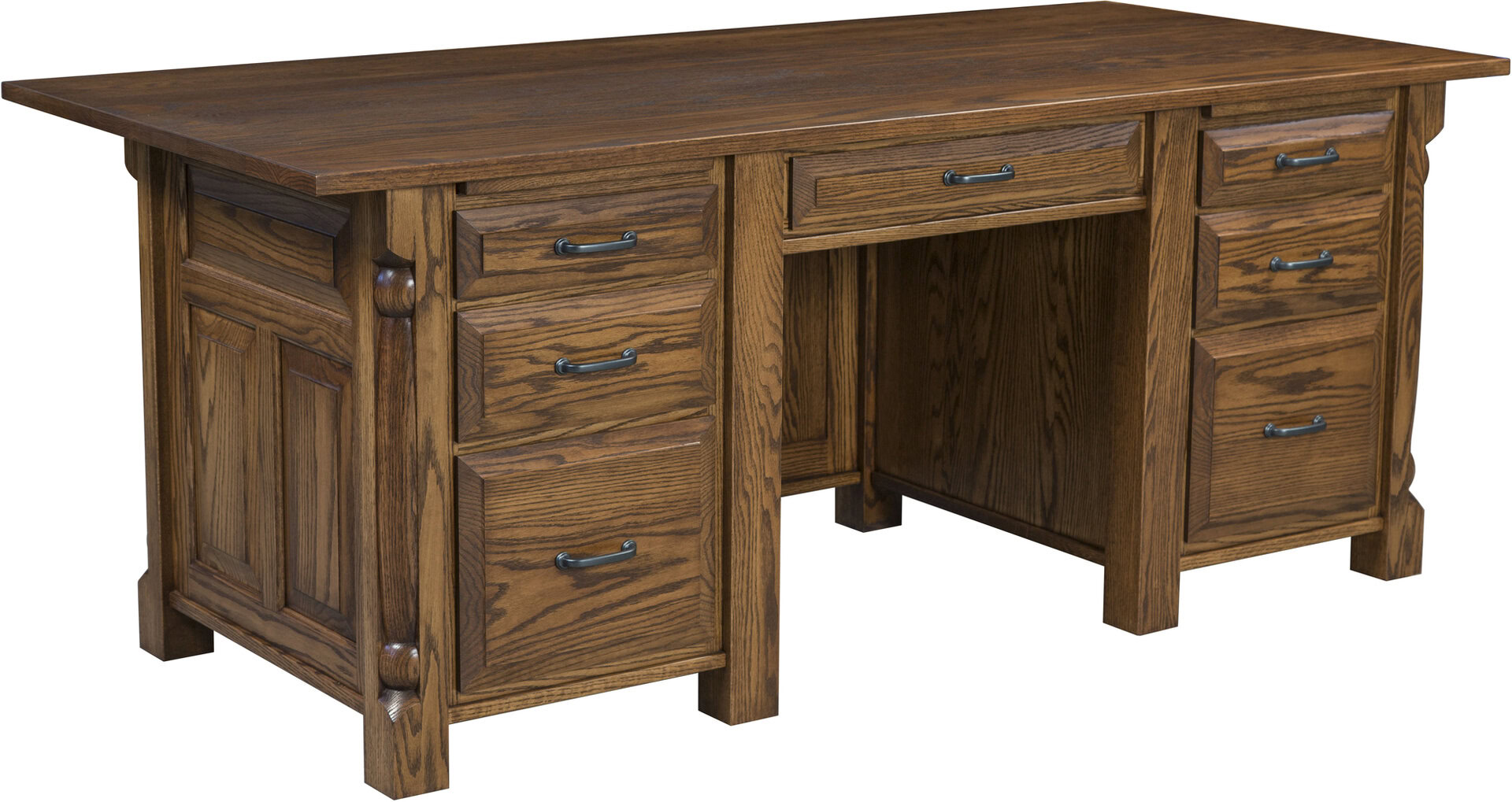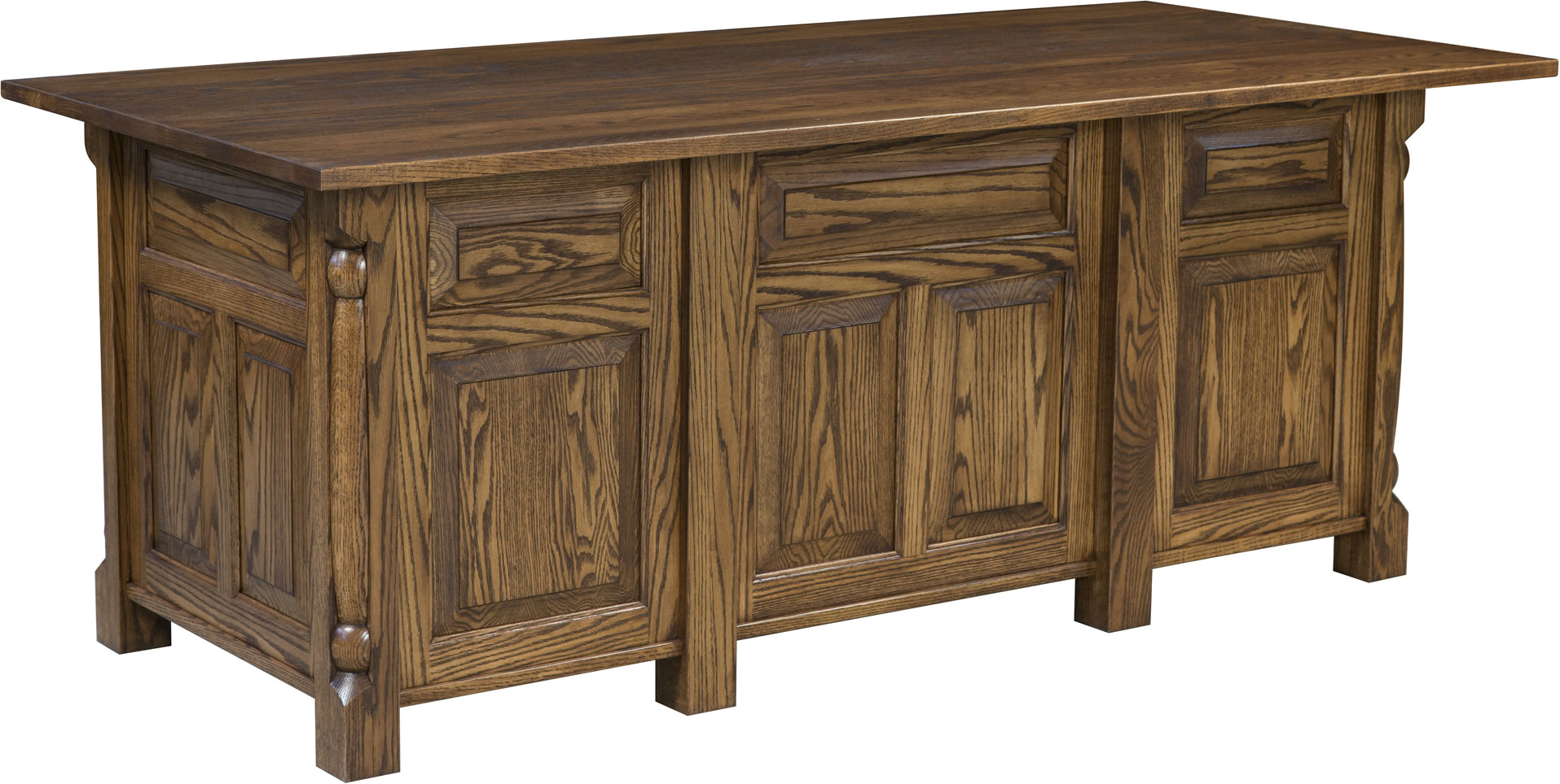 Presenting an office desk that’s unsurpassed in style, elegance, features and cabinetry. Meet the Quartet Flat Top Desk. Its carved posts and raised panel sides and back are sure to turn heads. We made the huge desktop from 1-inch-thick solid hardwood. And the two pull-out writing boards extend the work area. The drawers open full-extension. So, you’ll enjoy easy access to all the items inside. While the dovetail drawer joints excel in strength. The bottom drawers are ready for your letter-size files. You can also get a hidden compartment and locks for added security. Our Amish cabinetmakers build the desk. And they use top hardwoods like red oak (shown). No wonder the piece is so sturdy and heirloom-quality! Now, make it yours. Simply complete the customizing fields below. Also, make sure you include your choices for wood species, finish and more. Or call 855-768-3270.