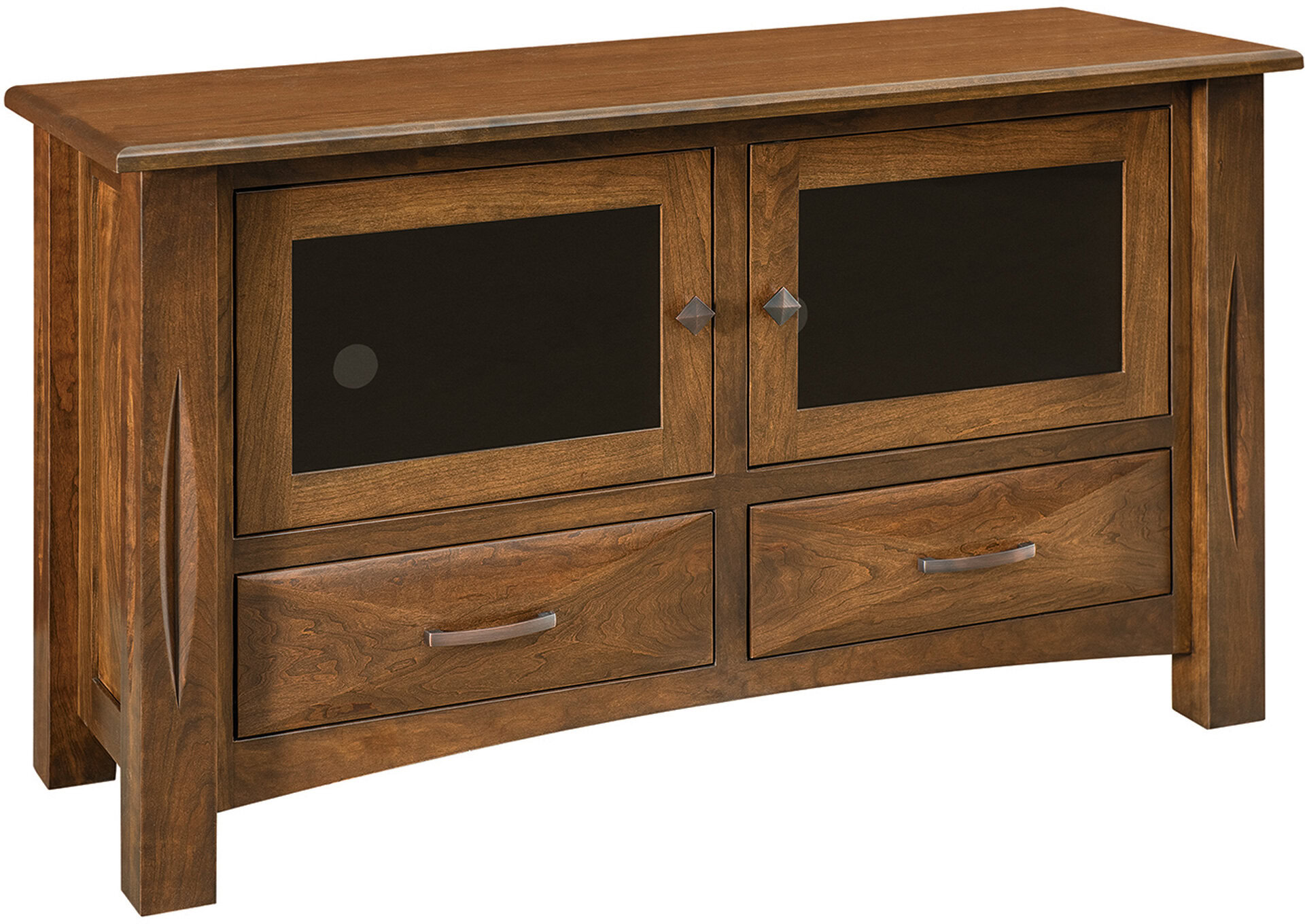 The sheer artistry of the Ravena Plasma TV Cabinet makes it the center of attention in your living room or den. Take the raised panels with ridges converging in the center. Also, check out the groove accents in the posts. We place an adjustable shelf behind each smoked glass door. So you can maximize the space for your electronic devices. What’s more, the drawers open full-extension. This means easy access to everything inside. Including items at the back. Options abound in the Ravena Plasma TV Cabinet. They include a live edge on the top. Also a sound bar just below. In addition, you can choose a small, medium, large or extra-large cabinet. Amish artisans build each unit. So it’s heirloom-quality! Now, make it yours. Simply complete the customizing fields below. With your choices for wood specie, finish and more. Or call 855-768-327