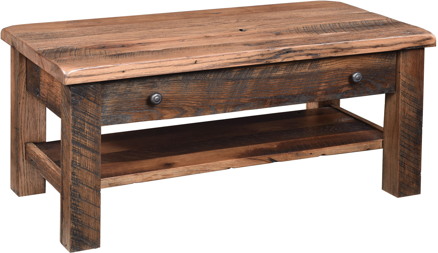 There’s no better way to show off your rustic preferences than to choose a Reclaimed Post Mission Coffee Table for your living room. Notice the hefty, plank-style tabletop with the uniquely finished edge. Also, check out the visible saw marks. The full-width drawer provides ample room for the usual living room items. While the large tabletop and shelf give you lots of space to display items like coffee table books and decorative items. Our Amish cabinetmakers build the table from top hardwoods like cherry, maple and reclaimed oak (shown with FP-Murky Stain). No wonder this piece is heirloom-quality! Now, make it yours. Simply fill out the customization fields below. Also, make sure you tell us your choices for wood species, finish and more. Or call 855-768-3270.
