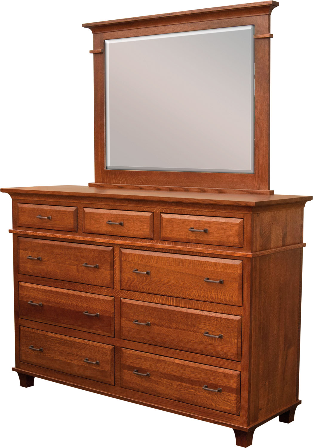 Check out the Rockwell Dresser with Mirror. Get the feel of grandeur? That’s totally understandable. Because the wood trim below the top drawers gives the piece a ‘chest-on-chest’ effect. While the trim on both sides of the beveled mirror and also at the base enhance the ornate look. Also, the nine drawers give you lots of handy storage space. Our Amish cabinetmakers build the dresser from top hardwoods like rustic quarter-sawn white oak (shown with Michael’s Cherry stain). This makes the piece superior to most bargain furniture built with wood substitutes like MDF, particle board and plastics. No wonder the dresser is so sturdy, it’s heirloom-quality. Now, make it yours. Simply fill out the customization fields below. Also, make sure you tell us your choices for wood species, finish and more. Or call/text 855-768-3270.