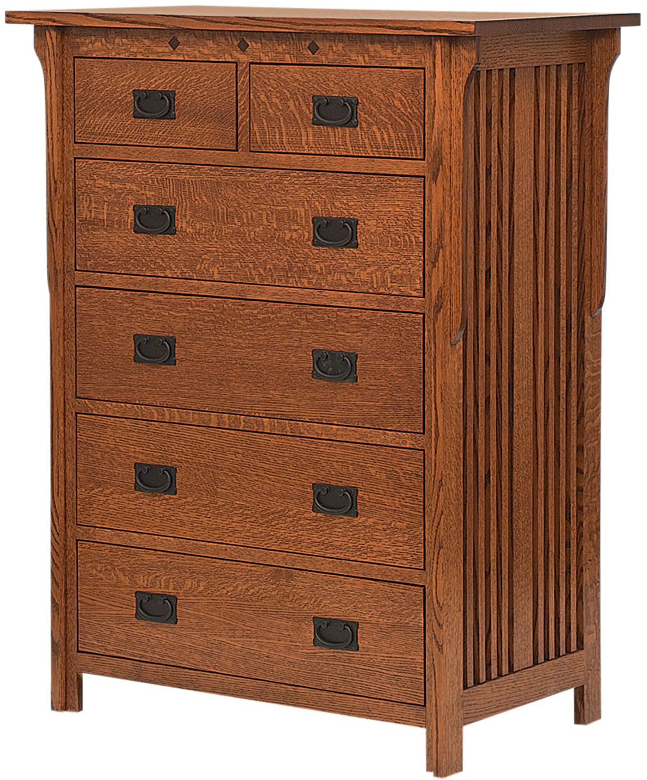The unique Royal Mission Chest blends traditional craftsmanship and timeless design. The Royal Mission Chest offers modern details like wood corbels and diamond walnut inlays and a 1-inch thick wood top. It is crafted by Amish artisans and is shown made from the finest Quarter Sawn White Oak with Michael’s Cherry Stain with its six full extension drawers. We feature the finest Amish-crafted furniture in the Midwest and want you to choose the furniture pieces that will work for your home! If you are interested in receiving a quote from us, please choose the options that best meet your needs and a furniture specialist will contact you, usually within 24 hours. Or if you just have a question not answered by our website, please send us a quote request or contact us via phone. We ship anywhere in the United States.