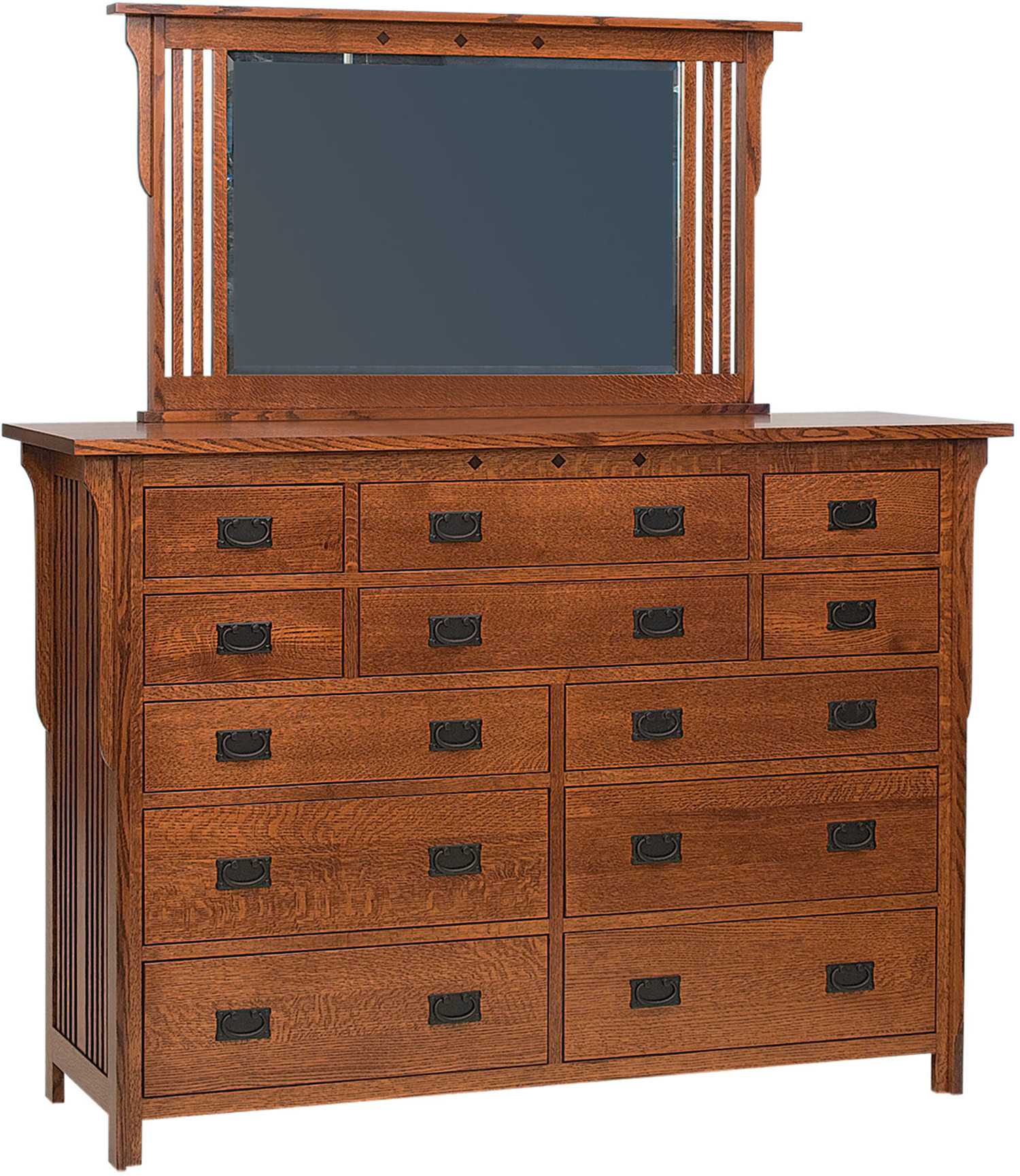The classically-styled Royal Mission Dresser boasts ample storage space. This Amish-crafted Royal Mission Dresser is built with sturdy Quarter Sawn White Oak hardwoods in Northern Indiana’s Amish country. Every piece can be personalized in your choice of hardwood, stain color and drawer pulls to match your style, but this Royal Mission Dresser is shown with Michael’s Cherry Stain and Black Mission Drawer pulls. The modern design of the Royal Mission Dresser also includes beautiful wood corbels and diamond walnut inlays. You can customize your pieces and we will ship them directly to your door or come into our store to see our furniture pieces first hand at Brandenberry Furniture in Shipshewana, Indiana. To find out more information and receive a quote, choose all the options that best match your needs and a furniture specialist will contact you, usually within 24 hours. Or if you just have a question not answered by our website, please send us a quote request or contact us via phone.