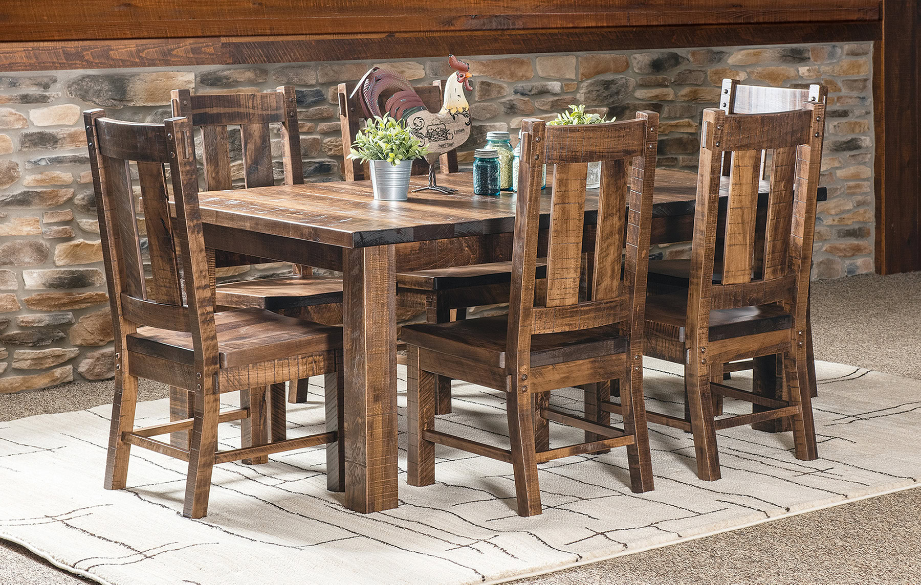 The rustic look of rough-sawn wormy maple is enhanced by the expert craftsmanship of Amish cabinetmakers. Meet the Santa Fe Leg Table. Indeed, the 1 ¾-inch top and elsewhere on the table feature natural knots, cracks and other rustic elements. In addition, we offer the table in widths of 42 and 48 inches. Plus lengths of 60, 66 and 72 inches. Wish to extend the table for family and friends? You can request up to three 16-inch leaves. Also, we have hundreds of chairs and a collection of benches to accompany the Santa Fe Leg Table. Fact is, the table is sturdy. Great-looking. Plus heirloom-quality! So make it yours. Simply complete the customizing fields below. Also, make sure you include your choices for wood specie, finish and more. Or call 855-768-3270.