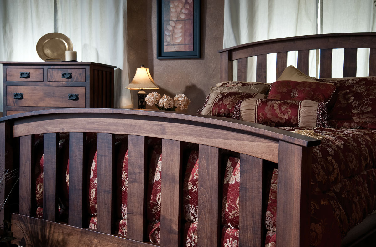 Elegant slats on the side panels plus a curved slat design on the bed. These features make the Schwartz Mission Bedroom Set stand apart. The flush drawer fronts and black Mission hardware enhance the stately Mission look. The set includes a king, queen or full-size bed plus a chest of drawers, nightstand and dresser with mirror. Also, the drawers open full-extension. This means easy access to the back of each drawer. Our Amish cabinetmakers build the set. And they use top hardwoods like cherry, oak and maple. It’s not surprising that the set is so handsome. Plus heirloom-quality! Now, make it yours. Simply complete the customizing fields below. Also, make sure you include your choices for wood specie, finish and more. Or call 855-768-3270.