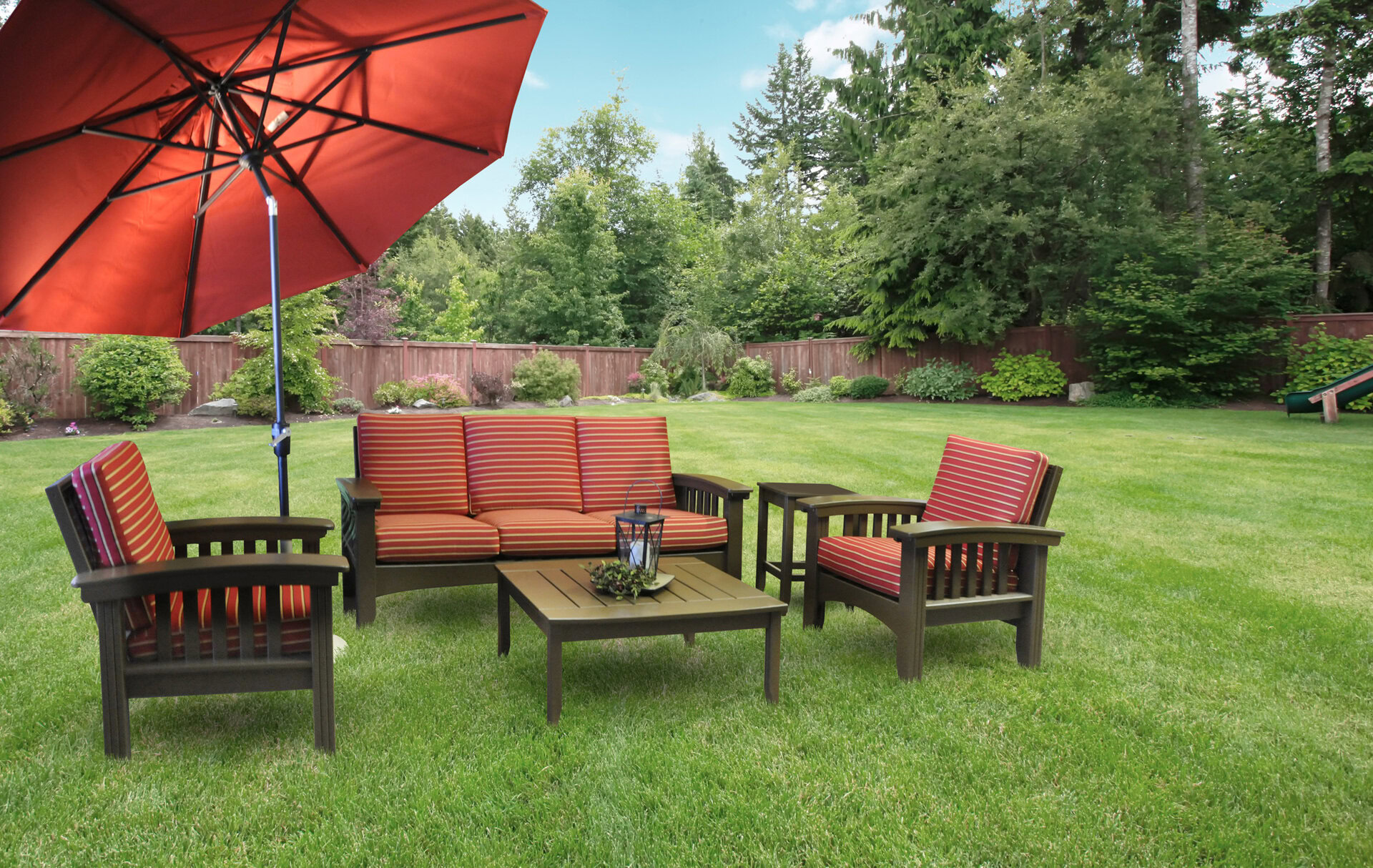 Signature Series Umbrellas come with a tilt and crank or cantilever umbrella. Choose the size that best fits your needs. Then, select one of our beautifully striped signature fabrics. Additionally, you can even add a starlight collar to your umbrella. Then, you can easily set the evening’s mood lighting. Let’s not forget to mention the lovely shade and sun protection this umbrella provides, too.
