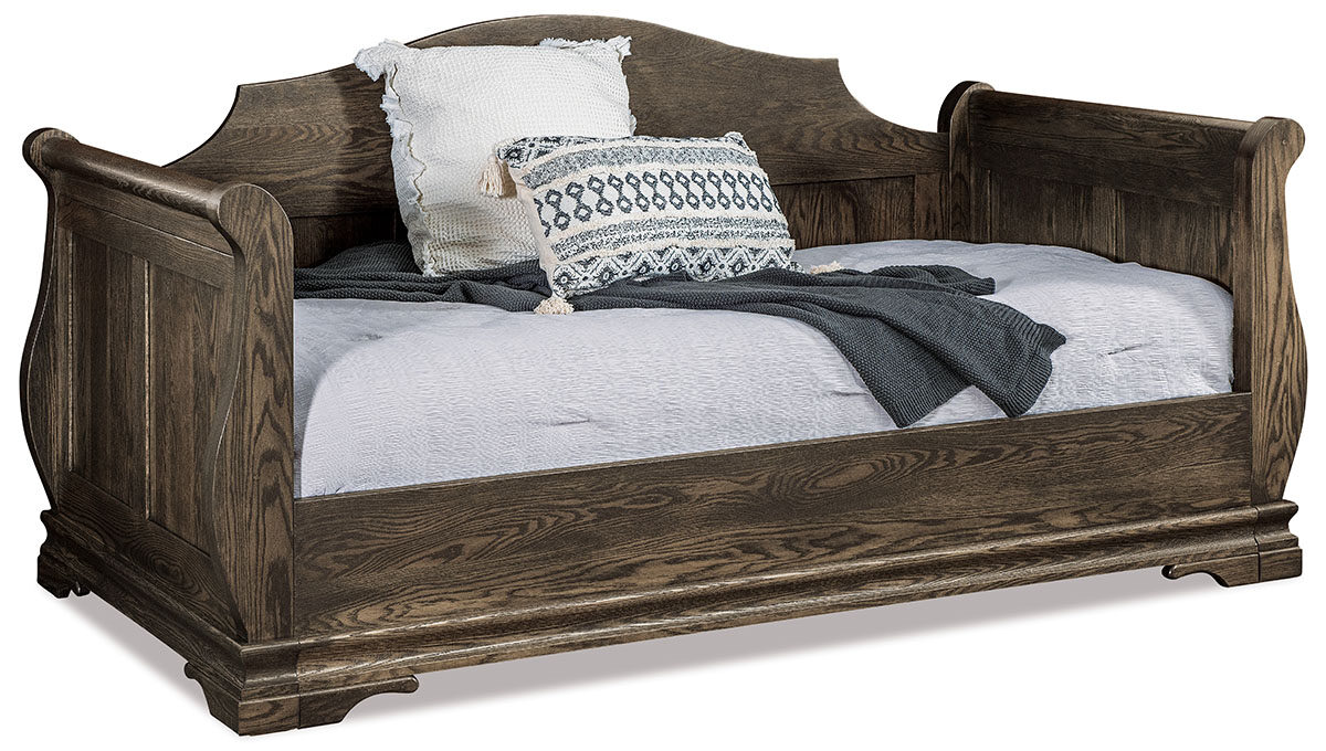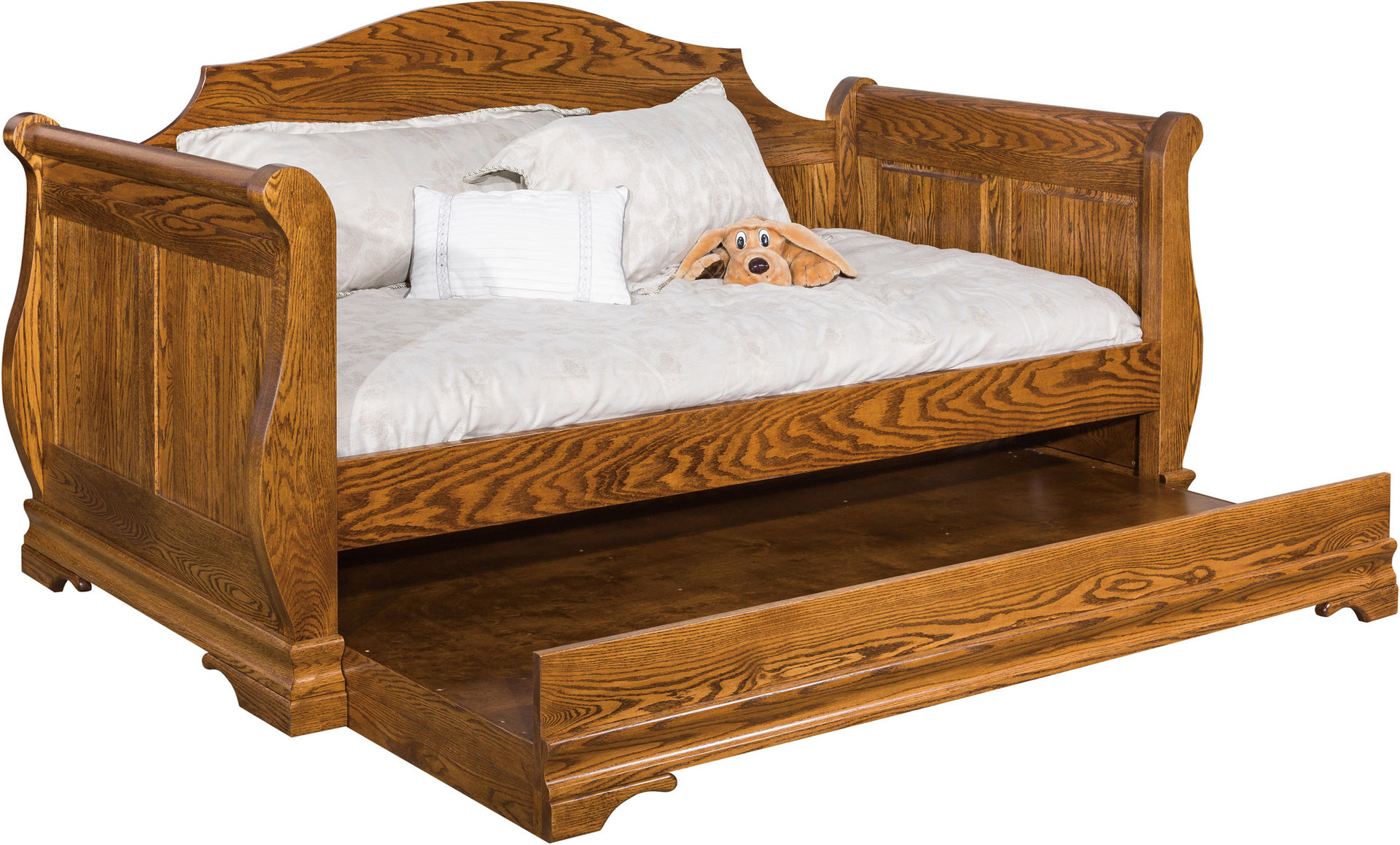 The classic sleigh design — with its sleigh-like curves and recessed panels — give the Sleigh Day Bed its ornate look. You can’t ask for a more lavish day bed to grace your second bedroom or elsewhere in your home. Plus, we equip the bed with a slide-out trundle bed. This means the day bed will come in handy when you entertain overnight guests! Our Amish cabinetmakers handcraft the day bed. And they use top hardwoods like cherry, maple and oak (shown with SWT stain). No wonder the day bed is so sturdy and heirloom-quality! Now, make it yours. Simply complete the customizing fields below. Also, make sure you include your choices for wood species, finish and more. Or call 855-768-3270.