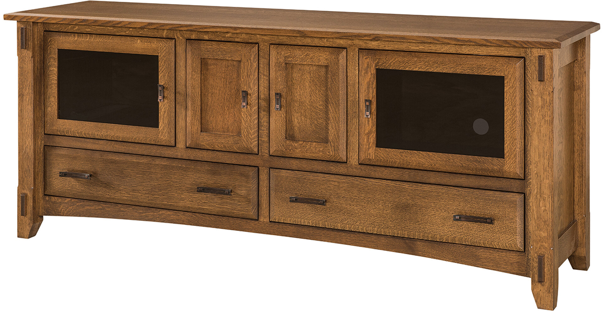 With its reversed raised panels and exposed tenon accents, the Tacoma Plasma TV Cabinet stands out from the crowd. Add to this its smoke glass doors (mullions available). Also solid hardwood Amish construction. And you get the best quality TV cabinet available! We place an adjustable shelf behind the doors. Also, the drawers open full-extension. So you’ll enjoy easy access even to the back of each drawer. In addition, the dovetail joints speak to the durability of the cabinet. Options abound. They include soft-close doors and drawers. A live edge top. Also a sound bar. What’s more, we offer the Tacoma Plasma TV Cabinet in your choice of small, medium, large and extra-large sizes. Now, make it yours. Simply complete the customizing fields below. With your choices for wood specie, finish and more. Or call 855-768-3270.