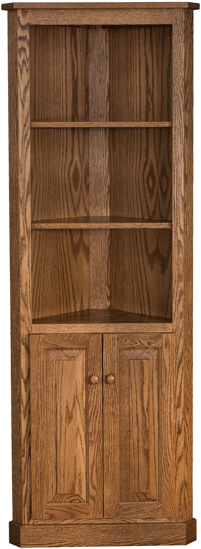 Turn an underused corner of your living room, dining room or home office into a corner of beauty and practicality. Choose the Traditional Hardwood Corner Bookcase. Its fixed shelves are ideal for displaying a combination of picture books, figurines, photos and the like. Wish to keep some items out of sight? Order the piece with two bottom doors. Our Amish cabinetmakers build the bookcase. And they use top hardwoods like brown maple (shown with FC-9017 Stain) and red oak (shown with MV Special Stain). No wonder the piece is so sturdy and heirloom-quality! Now, make it yours. Simply complete the customizing fields below. Also, make sure you include your choices for wood species, finish and more. Or call 855-768-3270.