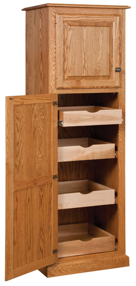 Notice the raised door panels and the rich, deep woodgrain. Also, check out the impeccable fit and finish throughout the unit. Impressed? You should be. That’s because skilled Amish cabinetmakers build each unit. And they use solid Midwestern hardwoods like oak, cherry, hickory, and medium walnut (shown). So you won’t find particleboard, veneered cardboard, or any other bargain substitutes anywhere. The pantry is so sturdy, you can expect it to be around for generations to come. You can order the unit as shown or unfinished. And we can customize it to fit your specifications.