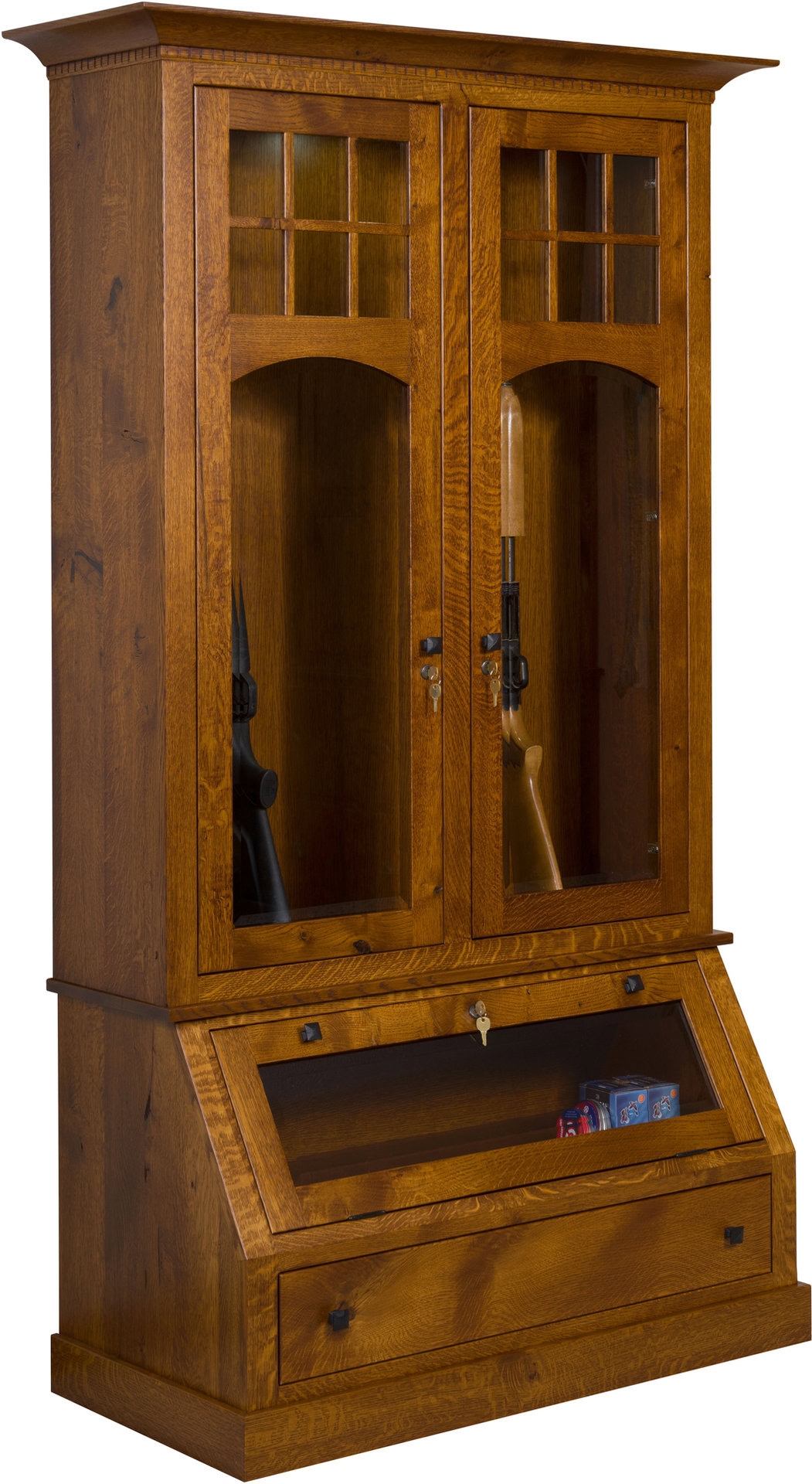 Proudly and safely display your prized gun collection with a cabinet that blends with your other furniture. Meet the Tribecca Custom Gun Cabinet. Inside, you’ll find a 12-gun divider and felt-lined bottoms. The beveled glass doors with mullion add a decorative touch. LED lighting keeps your firearms lit, while the light guard prevents light from seeping around the flush doors. The drawer opens full-extension for easy access to everything inside. And it closes with a gentle push. Locks are standard. Our Amish cabinetmakers build the cabinet from top hardwoods like cherry (shown with Michael’s Cherry stain). No wonder the cabinet is so durable, it’s heirloom-quality! Now, make it yours. Simply fill out the customization fields below. Also, make sure you tell us your choices for wood species, finish and more. Or call 855-768-3270.