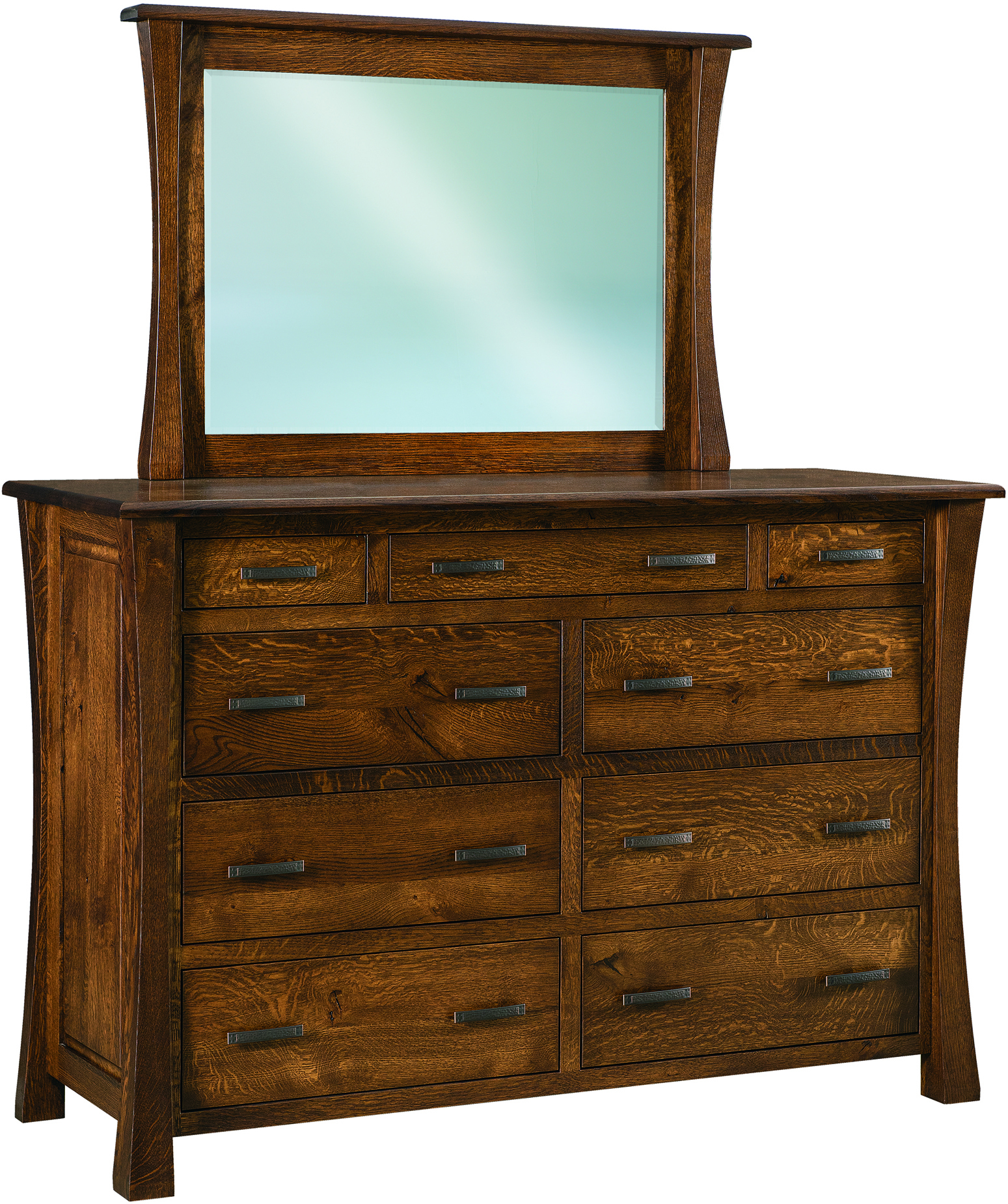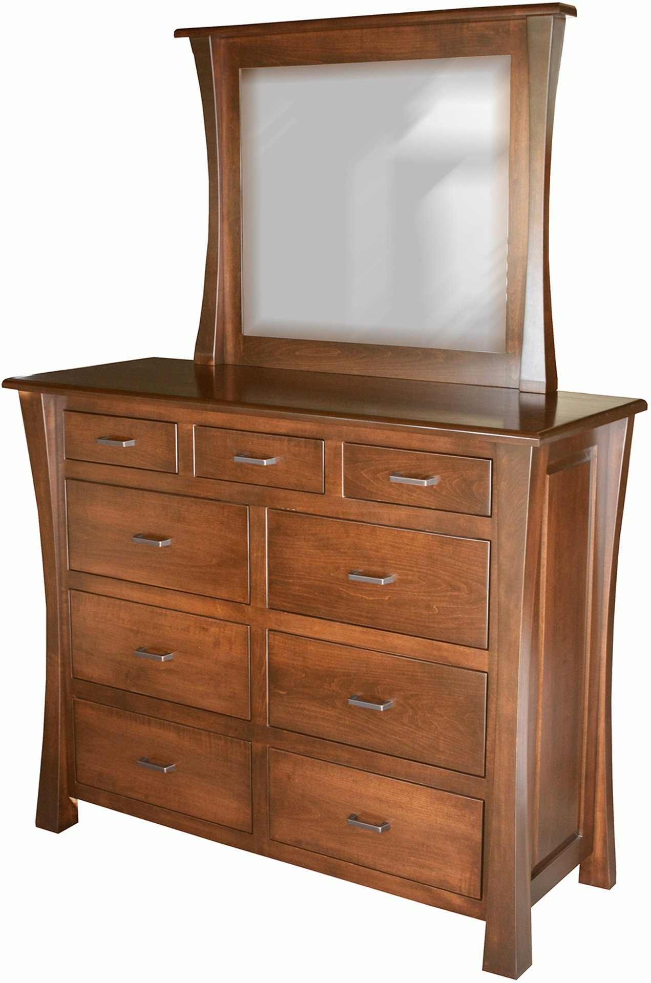 Curved profile, flared legs and raised panel sides. These features give the Vandalia Nine-Drawer Mule Dresser its sophisticated look. And what awesome storage potential! Because you get nine drawers. And each drawer opens full-extension. So getting items into and out of the drawers is easy. While the dovetail drawers excel in strength. Amish cabinetmakers handcraft each Vandalia Nine-Drawer Mule Dresser. And they use top regional hardwoods. Like cherry, maple and oak. So the dresser is heirloom-quality! Also, you can choose a ‘narrow’ (53 1/2-inch) unit or a ‘wide’ (64 1/2-inch) dresser (shown). Now, make it yours. Simply complete the customizing fields below. With your choices for wood specie, finish and more. Or call 855-768-3270.