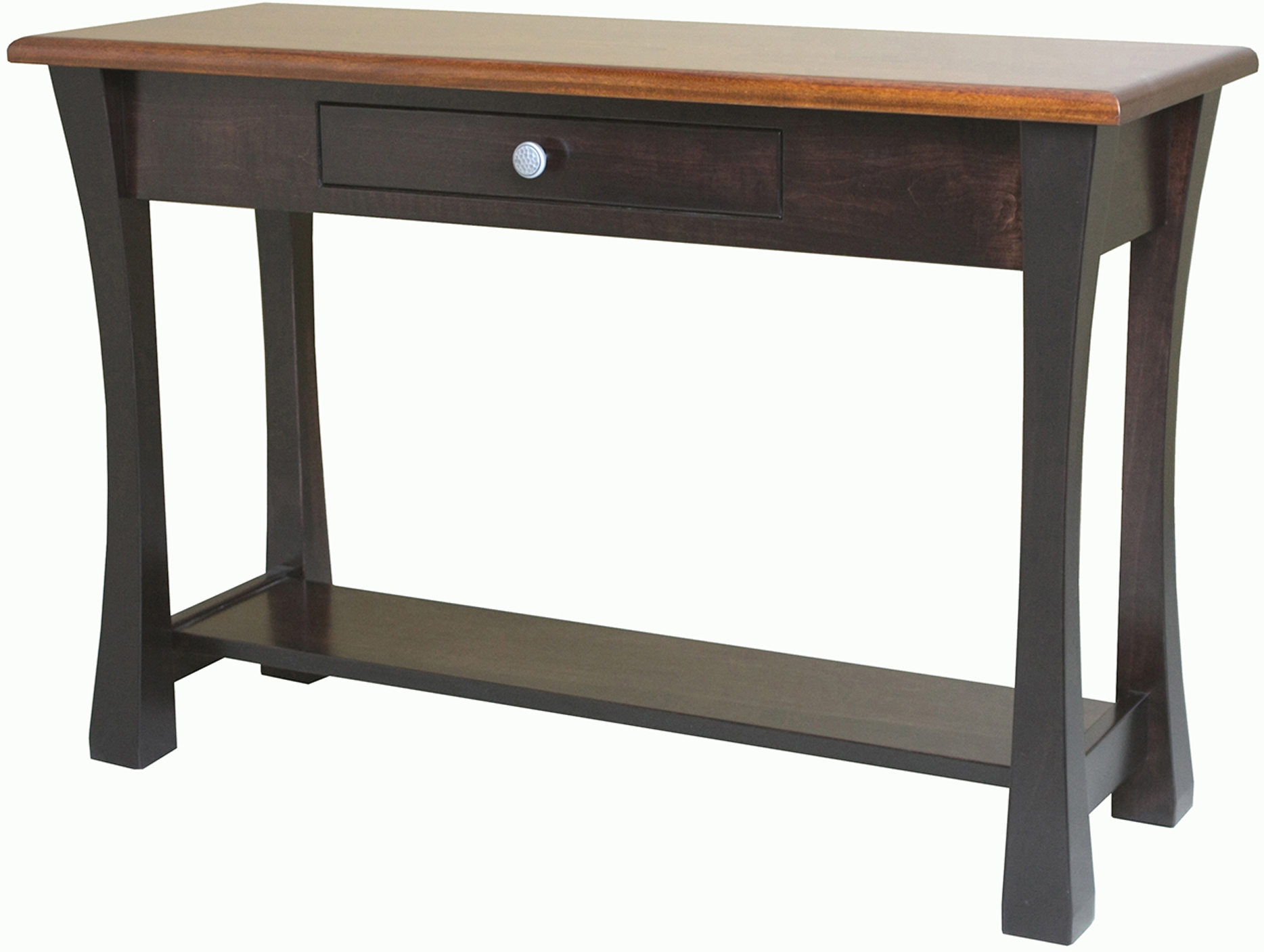 Curved legs, open stance and a rich Tavern Stain finish. These features make the Vandalia Open Sofa Table a great addition to your living room. So imagine this sofa table alongside your sofa. And proudly displaying your table lamps, books, photos and the like! The drawer opens full-extension. As a result, you’ll enjoy easy access to everything inside. Also, the dovetail drawer joints are unparalleled in strength. Amish artisans build each table. Also, they use top hardwoods. Like oak, cherry and rustic hickory (shown). So the Vandalia Open Sofa Table is heirloom-quality! Options abound. They include a soft-close drawer. A live edge top. Also an attached power strip. Now, make it yours. Simply complete the customizing fields below. With your choices for wood specie, finish and more. Or call 855-768-3270.