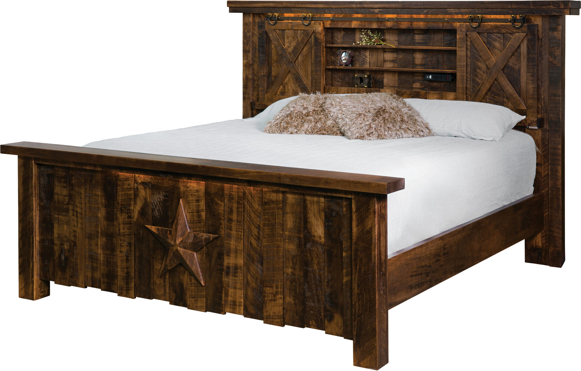 The Vandella Bed brings the classic charm of traditional American barns to your bedroom. For example, it features barn-style sliding doors that open up to reveal shelves for decorative items. Also, notice the barn-style ‘X’ design in the headboard and star on the footboard. What’s more, you can add lights – just below the top! You can order the bed in king (shown), California king, queen and full sizes. This means you can get the size that best meets your desires. Our Amish cabinetmakers build the bed. And they use top hardwoods like rustic rough-sawn brown maple (shown with Almond stain #10 sheen). No wonder the bed is so sturdy and heirloom-quality! Now, make it yours. Simply complete the customizing fields below. Also, make sure you include your choices for wood species, finish and more. Or call 855-768-3270.