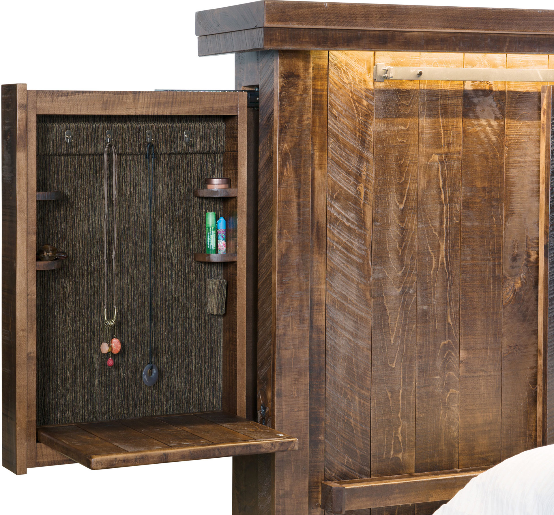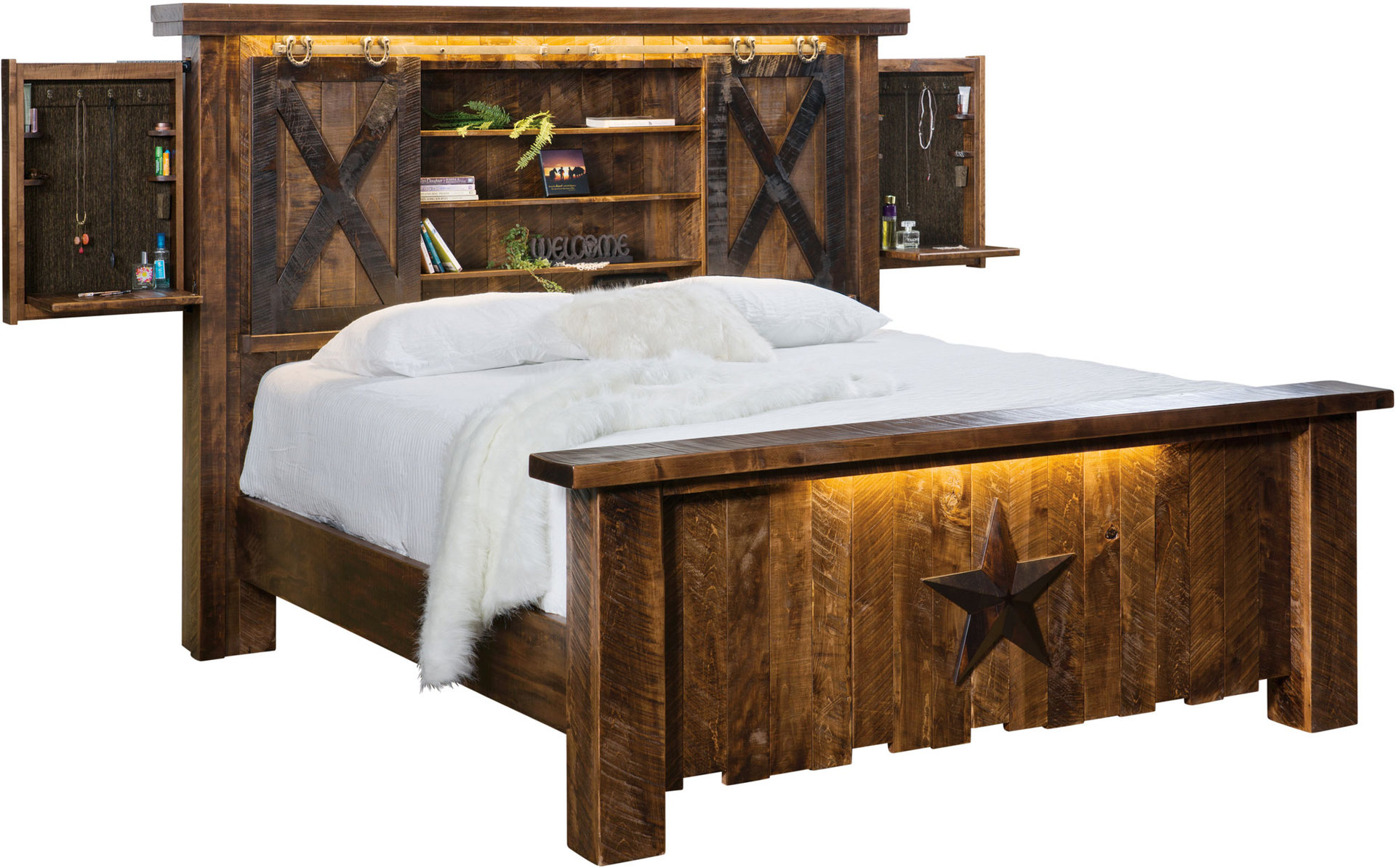 Light up your bedroom with a range of special features not normally found in a bed. Choose the Vandella Deluxe Bed. The headboard features barn-style sliding doors that open up to reveal shelf space. Also, there’s an optional jewelry pullout on each side of the headboard. Plus, notice the barn-style ‘X’ design and the star on the foot of the bed. What’s more, you can add lights! We offer the bed in king (shown), California king, queen and full sizes. Our Amish cabinetmakers build the bed. And they use top hardwoods like rustic rough-sawn brown maple (shown). No wonder the bed is so sturdy and heirloom-quality! Now, make it yours. Simply complete the customizing fields below. Also, make sure you include your choices for wood species, finish and more. Or call 855-768-3270.
