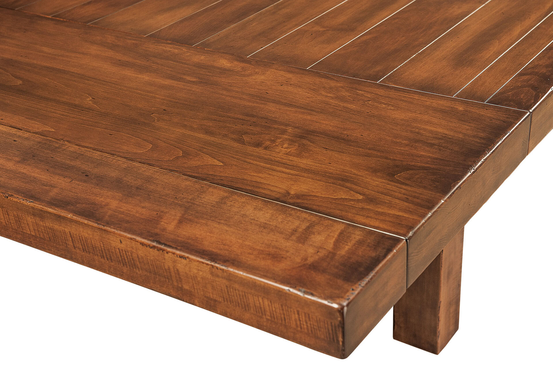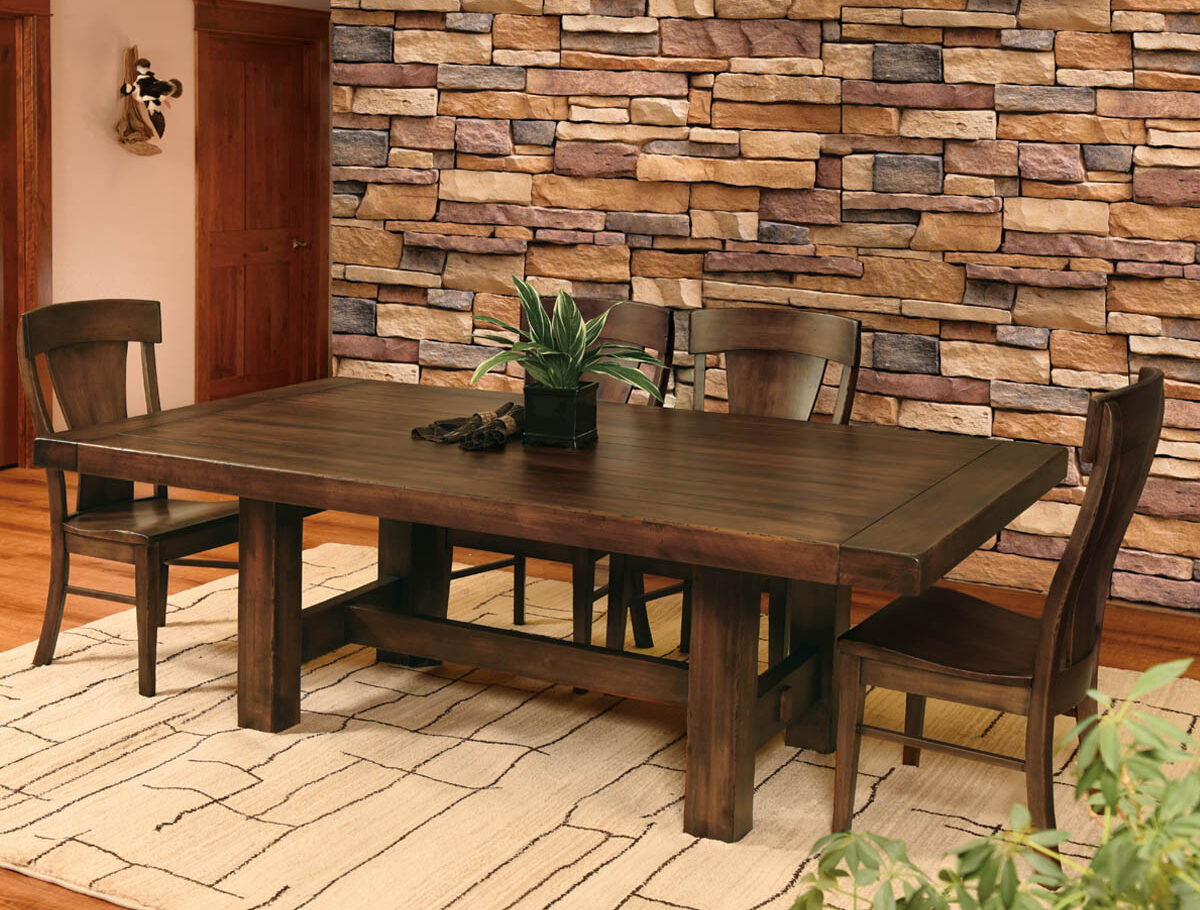 Everything about this table and chairs is substantial. You can see this from the Wellington Trestle Table’s three-inch-thick tabletop to the 88-inch table length. Additionally, you even have the option to add up to two 16″ leaves to extend the length of this table even further. The beautiful tabletop has random grooves with breadboard ends. Pair this table with the Ramsey Chairs and you truly have a functional piece of art that you will be proud to display and use in your home. Be sure to specify brown maple wood species with worn spice medium distressed 10-sheen stain if you want your Wellington Trestle Dining Set to look the same as the one here.