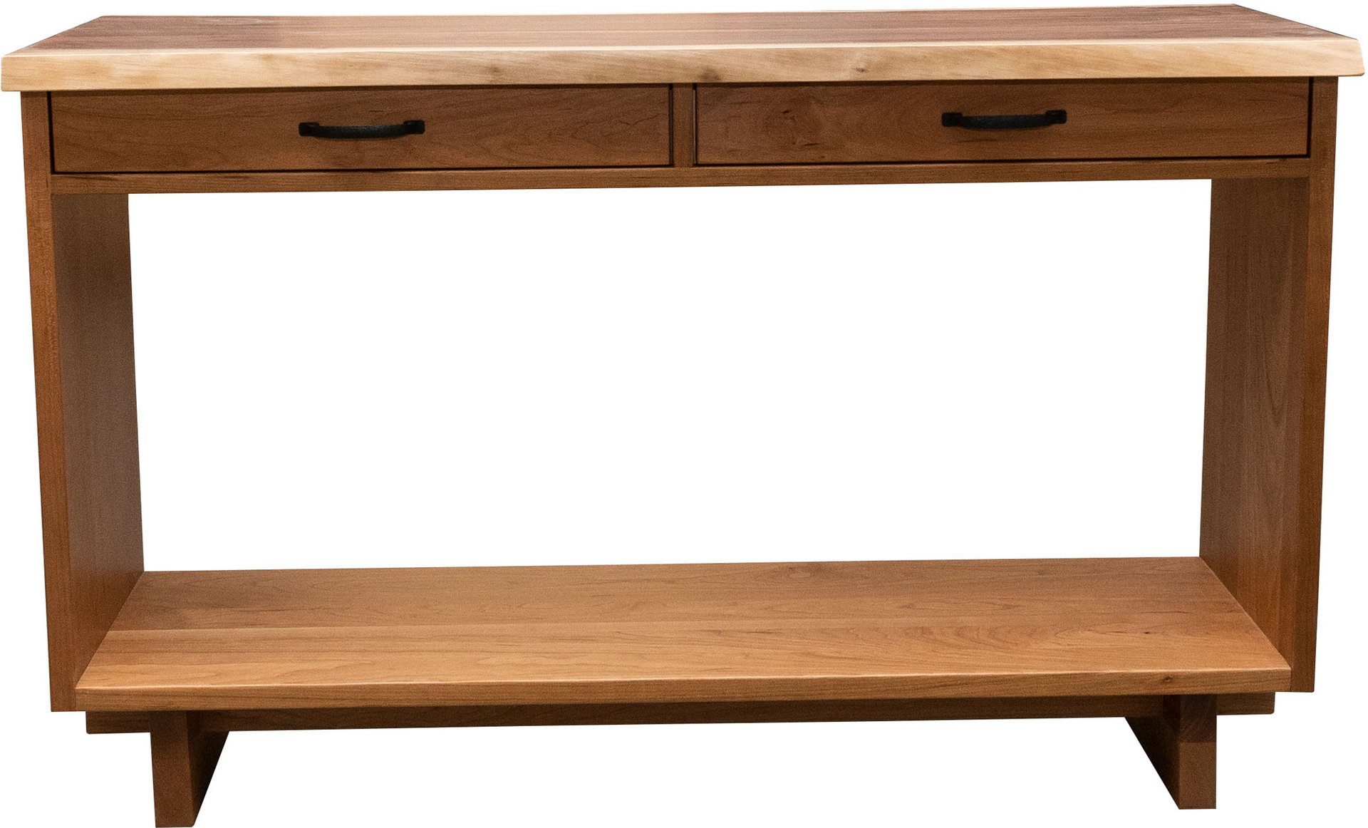 Here’s a sofa table that gives you a large space to display decorative pieces like photos, figurines, tabletop books and the like. It’s the West Canyon Sofa Table. What a trendy piece for your modern living area! The hefty, 1 3/8-inch tabletop has a live edge. So the table you order will be unique. Also, the two drawers open full-extension. This means you’ll enjoy easy access to everything inside. Even items at the back. Our Amish cabinetmakers handcraft each sofa table. Also, they use top hardwoods. Like hickory, cherry, maple and oak. No wonder the sofa table is so sturdy. Durable. Also heirloom-quality! Now, make it yours. Simply complete the customizing fields below. Also, make sure you include your choices for wood specie, finish and more. Or call 855-768-3270.